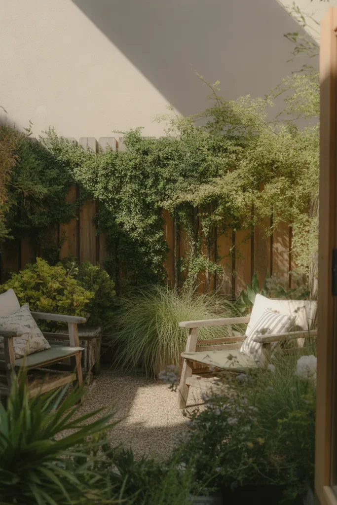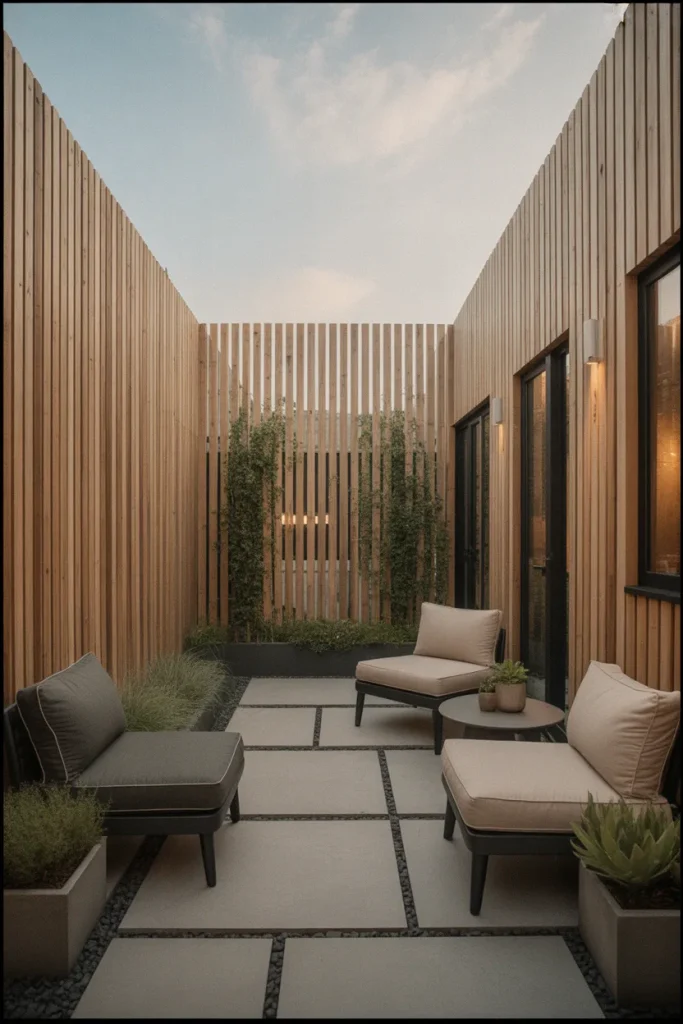This approach to small backyard landscaping in 2026 focuses on creating a calm retreat using modern lines and smart privacy solutions. A compact patio framed with slatted wood panels or slim hedges defines the space without crowding it. The look feels clean but warm, making it ideal for homes where the backyard is visible from neighboring windows.