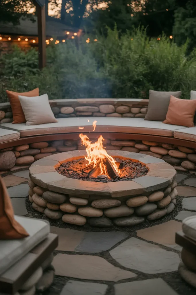 One of the best ideas for tight yards is integrating a fire pit with built-in seating. The layout encourages conversation while maximizing seating. Curved benches soften the layout.