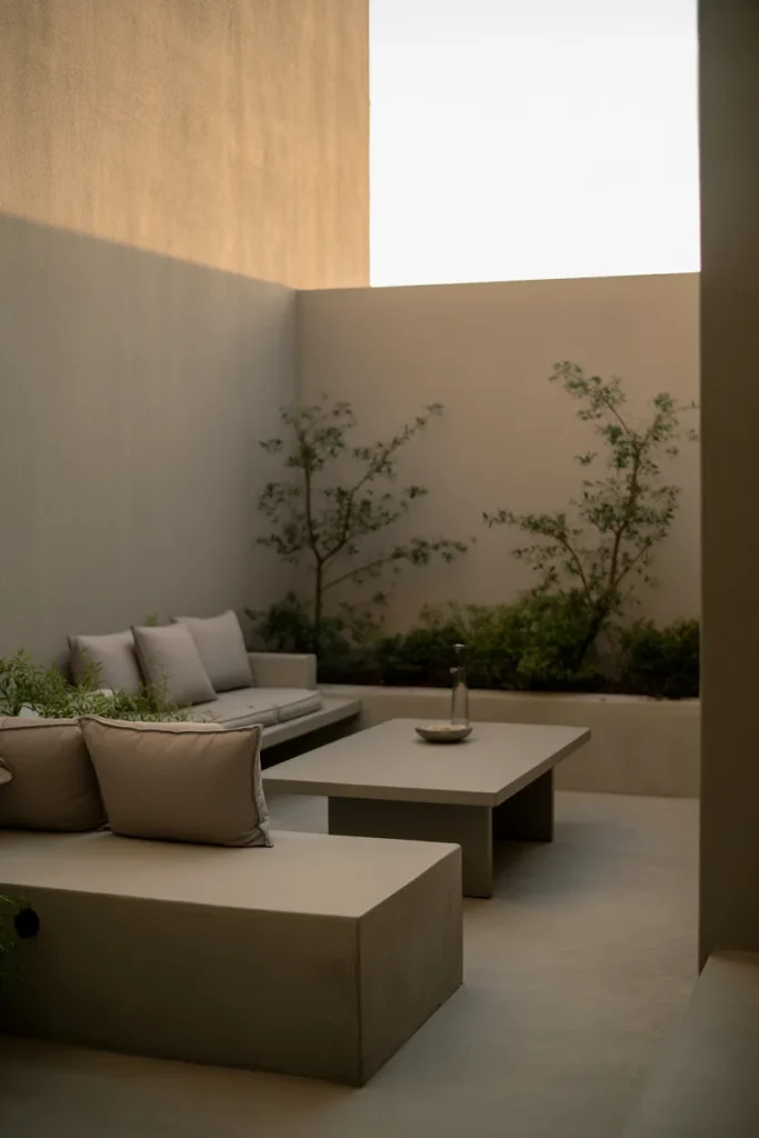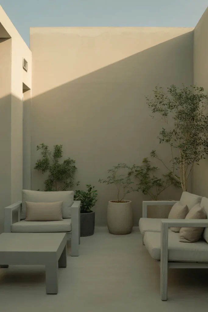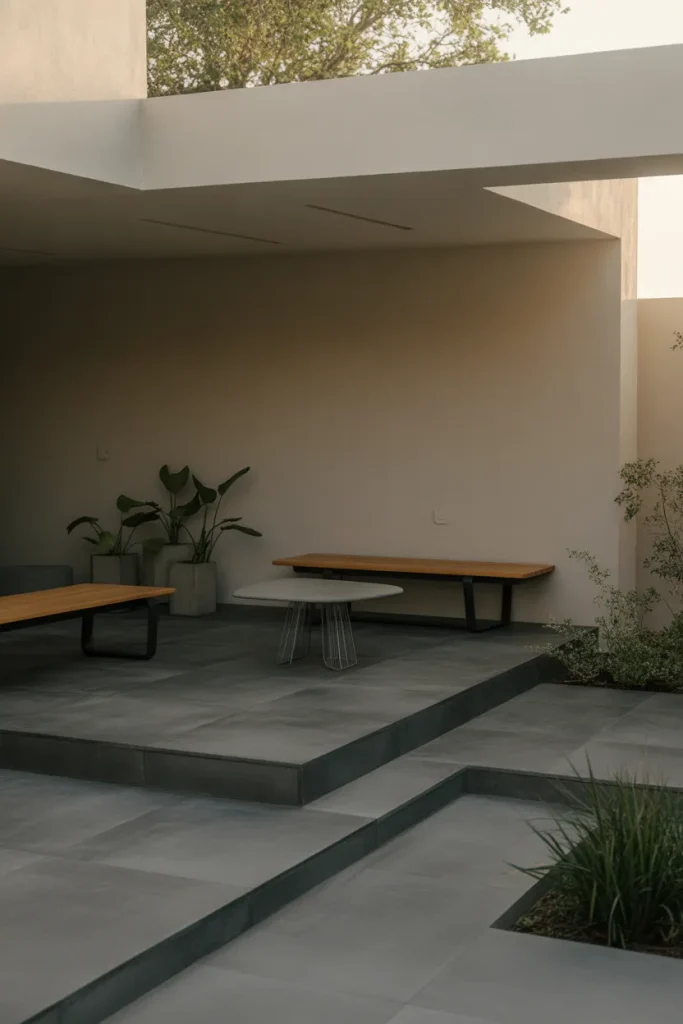 This very restrained concept highlights modern surfaces and minimal planting. Clean lines and neutral tones define the patio while leaving visual space to breathe. It’s a confident take on designs for small yards.