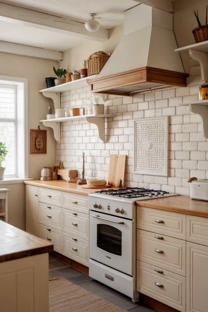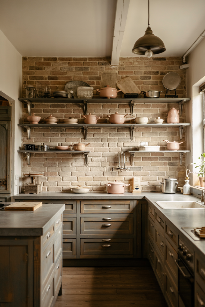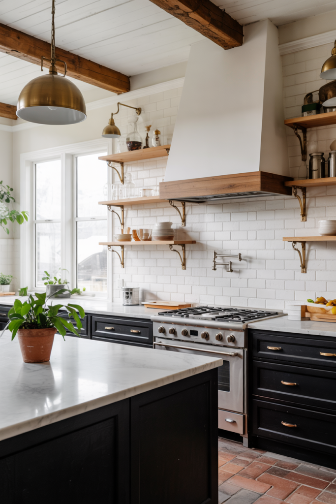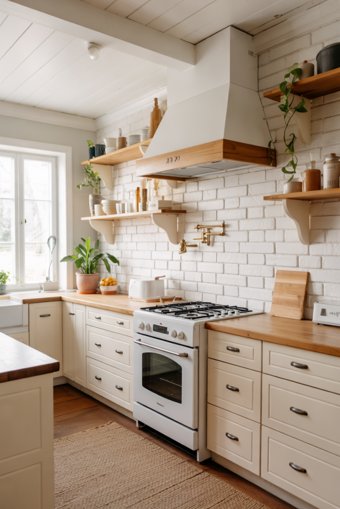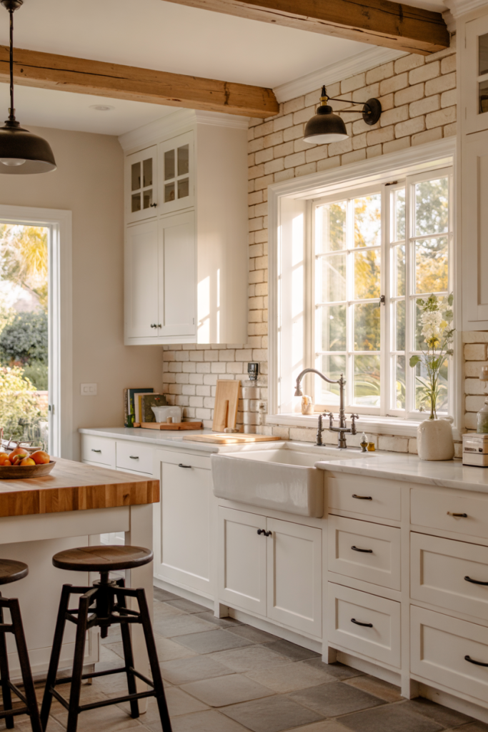 Designers are rediscovering brick as a warm, grounding backsplash tile choice for modern farmhouse kitchens. Whitewashed or natural, it pairs beautifully with white cabinets and wood counter decor. Add black iron shelves or light fixtures for contrast. It’s a touch of vintage soul that makes the space feel lived-in.