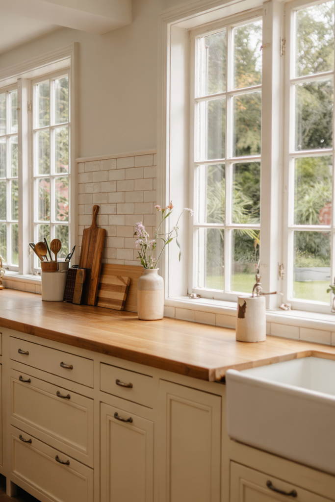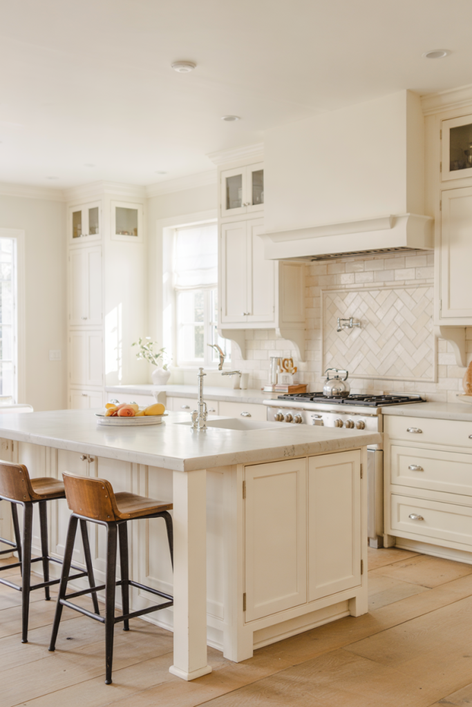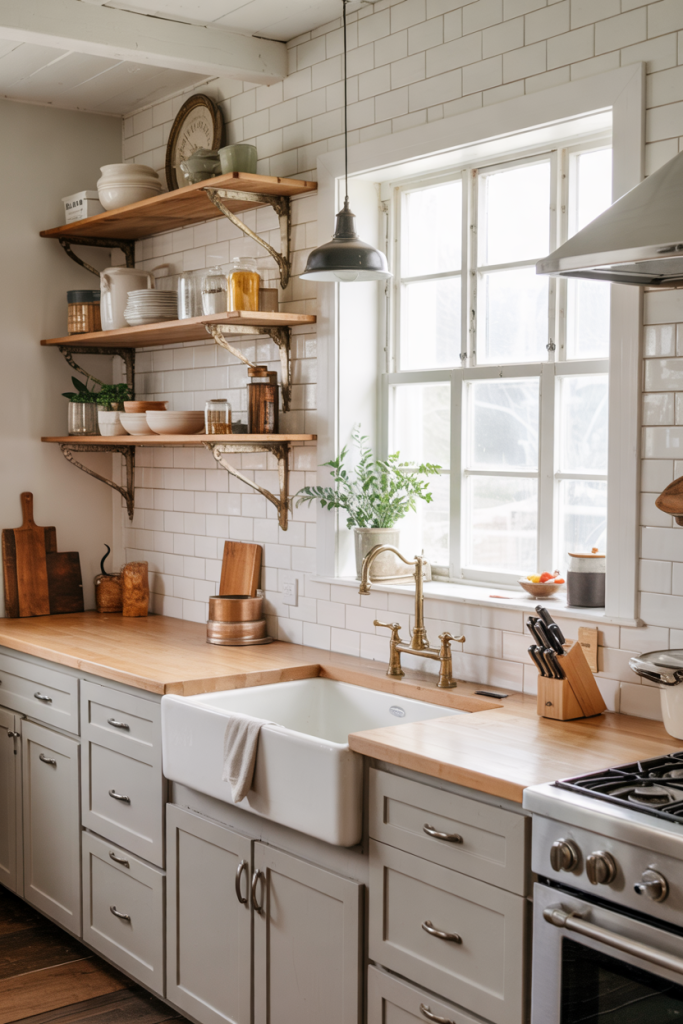 “White cabinets continue to remain the core of the farmhouse kitchen design. However, 2026 introduces paint shades that have slight undertones such as off-white and greige. This can add a lot of charm to the kitchen when paired with the texture patterns available in handmade tiles and wooden counter decor. This design feels very 2026. ”
