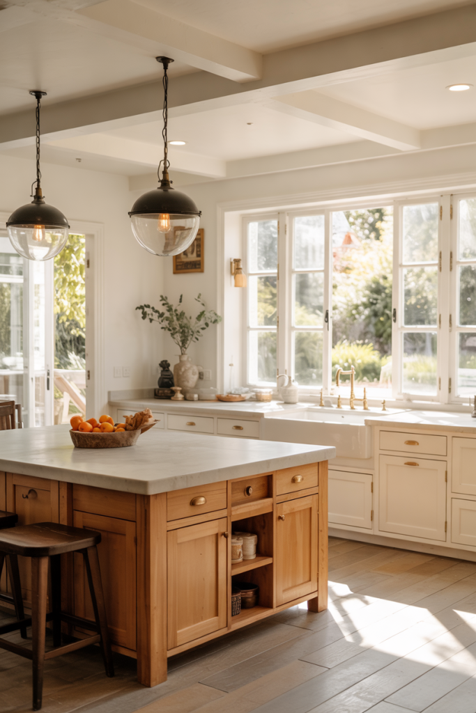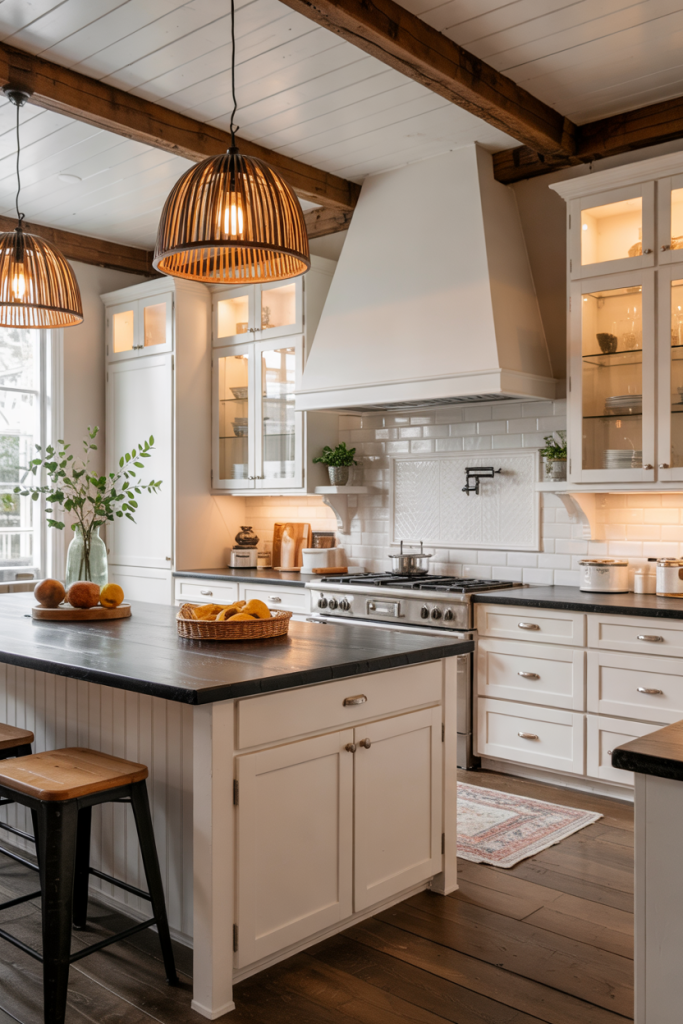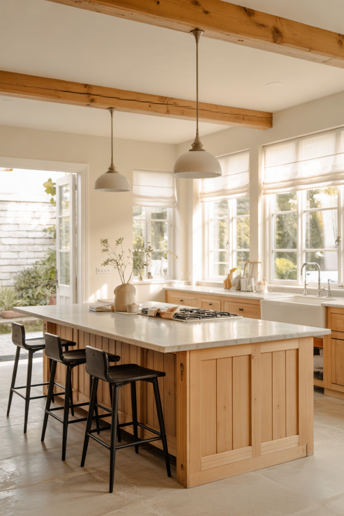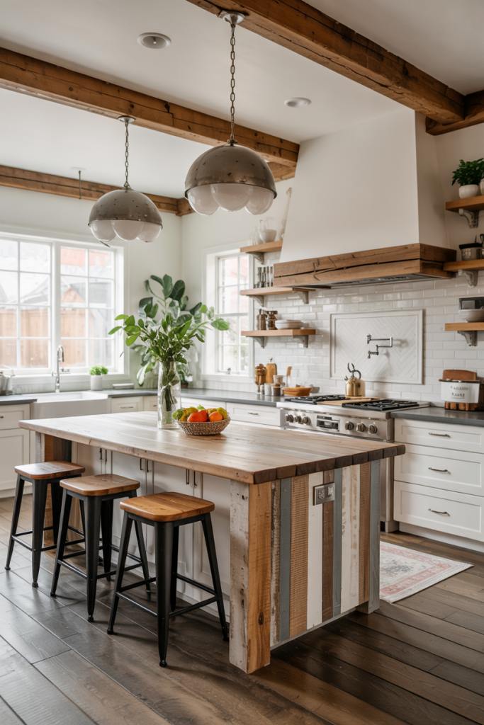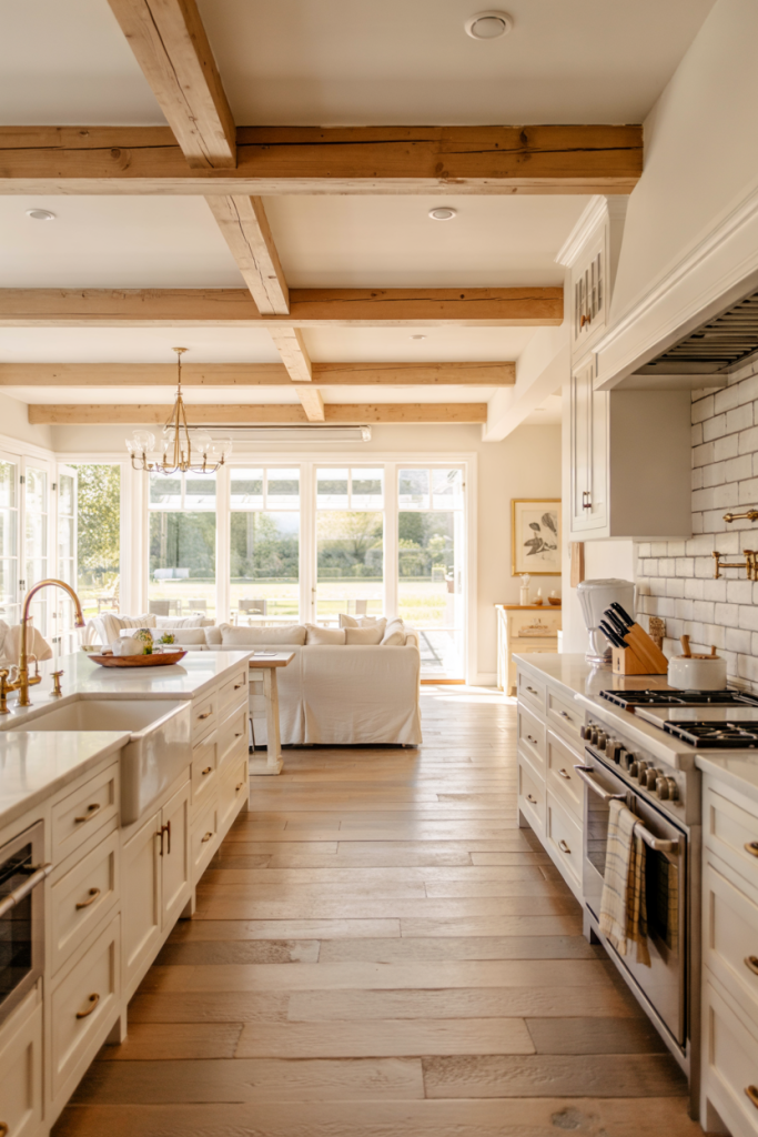 The ceiling often gets overlooked, but in 2026, rustic exposed beams or paneled planks bring warmth from above. Paired with white cabinets and subtle light fixtures, they make even modern layouts feel grounded. It’s a nod to classic barns — reimagined with a designer’s touch.