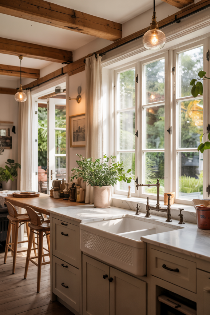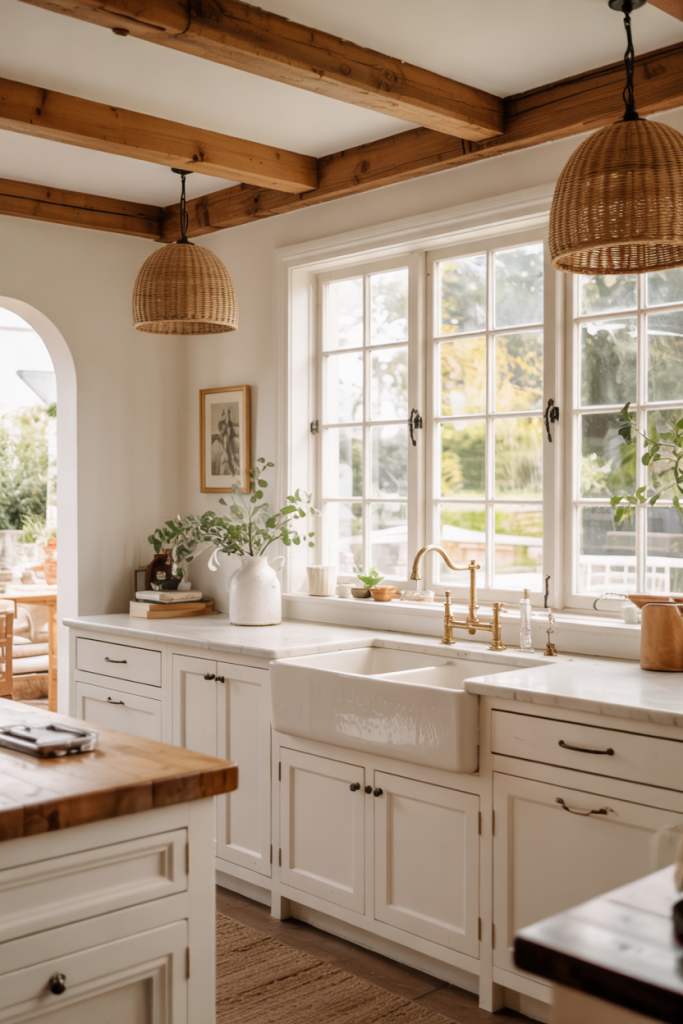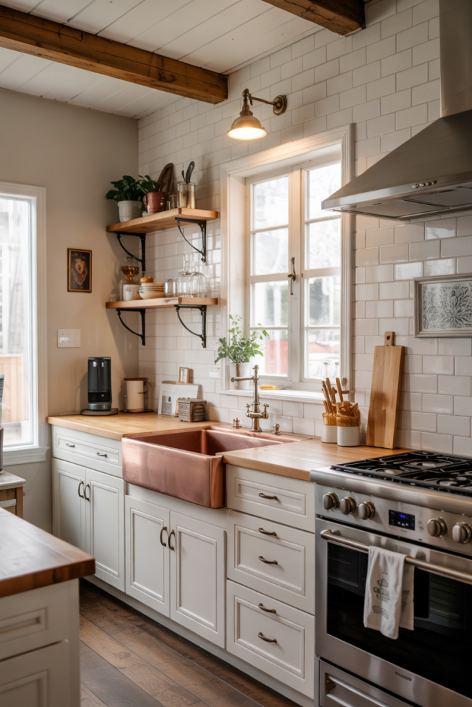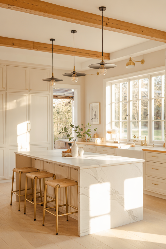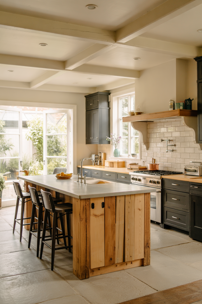 The ceiling often gets overlooked, but in 2026, rustic exposed beams or paneled planks bring warmth from above. Paired with white cabinets and subtle light fixtures, they make even modern layouts feel grounded. It’s a nod to classic barns — reimagined with a designer’s touch.
