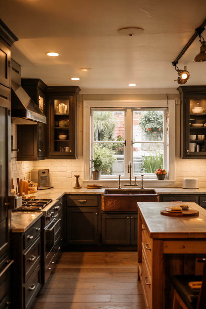 2026 brings a gentler take on black cabinets — think matte finishes paired with oak shelving or a walnut island. The contrast feels moody but inviting, especially when paired with amber light fixtures and soft paint colors on the walls. It’s a sophisticated twist on the farmhouse palette — cozy yet undeniably modern.