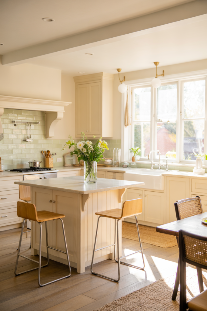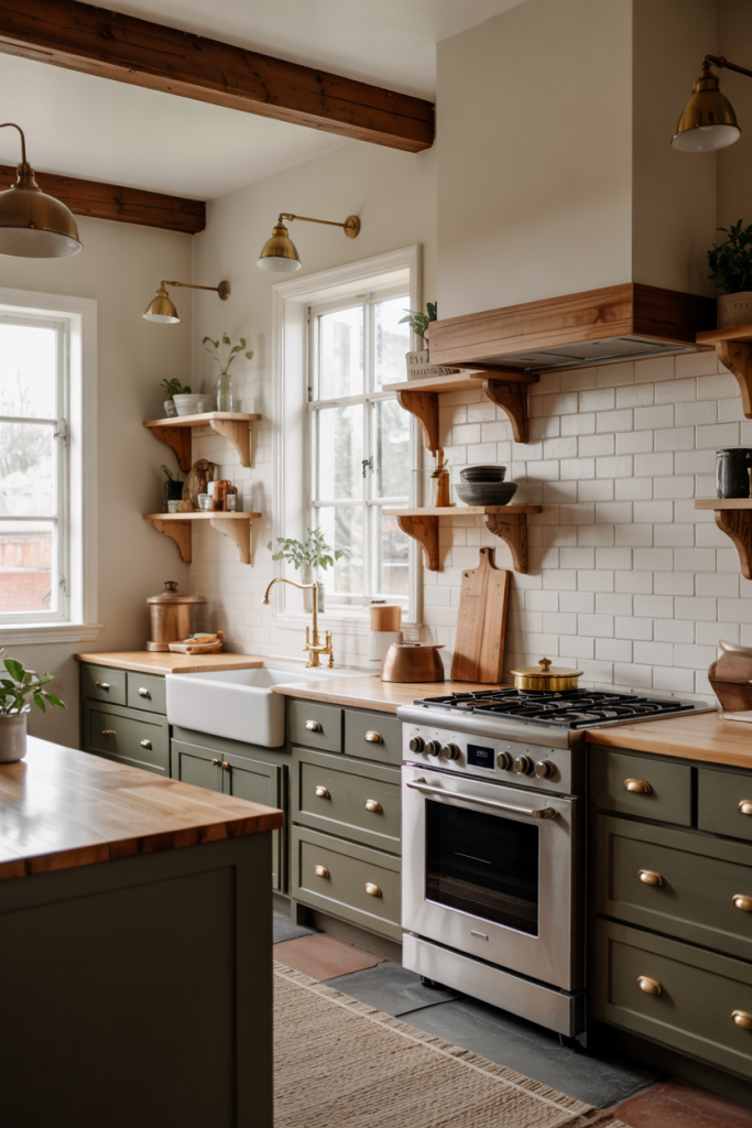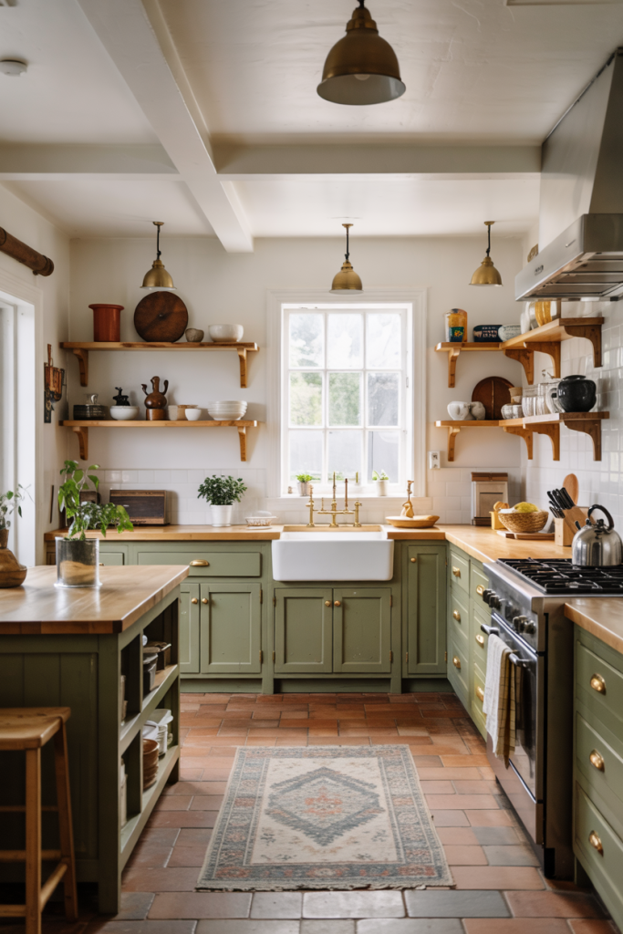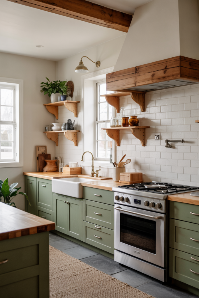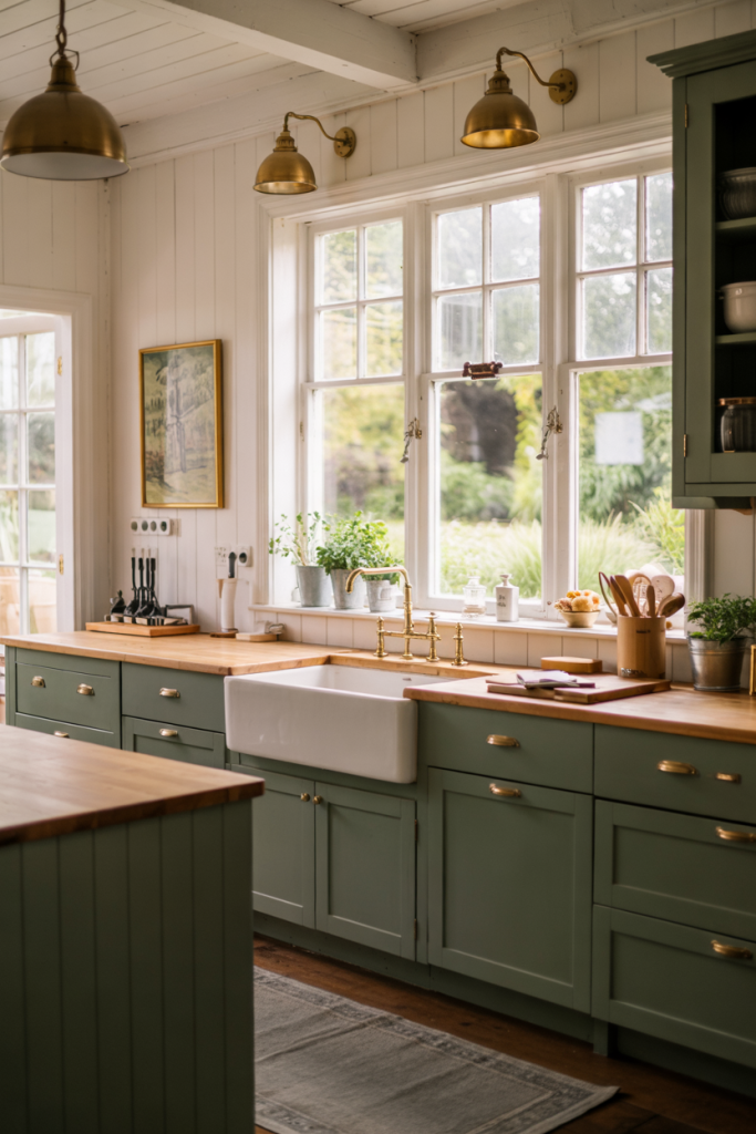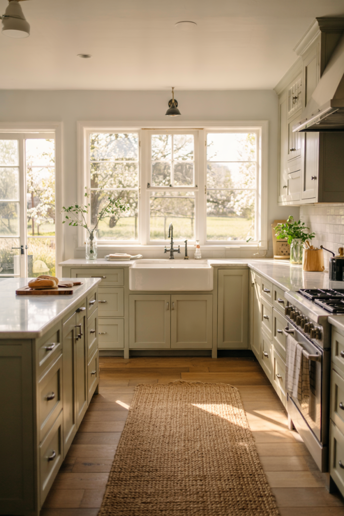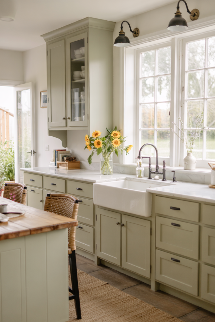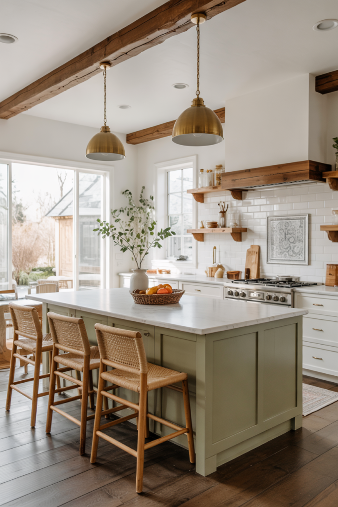 Soft paint colors like sage or moss green dominate 2026 farmhouse kitchens. Used on cabinets or the island, they pair beautifully with white countertops and black accents. Add woven baskets or ceramic counter decor for that organic touch — a calm, nature-rooted vibe that feels effortlessly fresh.