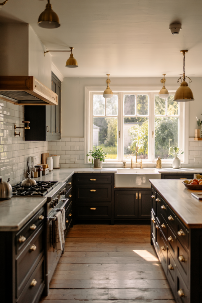 22. Moody Farmhouse with Dark Colors and Brass Accents