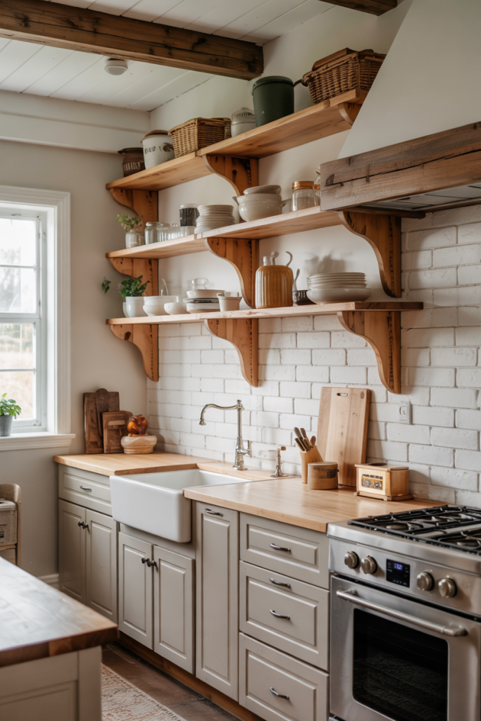 In 2026, the incorporation of open shelving in the farmhouse-style kitchens endures. This shall showcase only the selected decorative elements: handcrafted ceramics and vintage ceramics or baskets. This theme appears very natural when paired with white kitchens and the neutral paint color in the room.