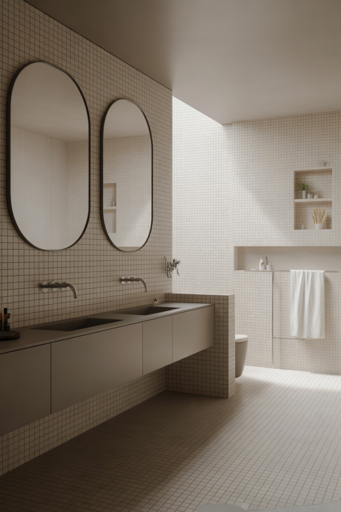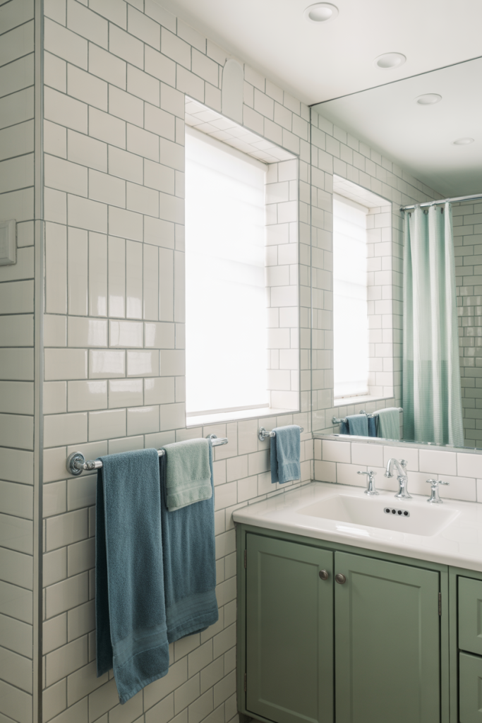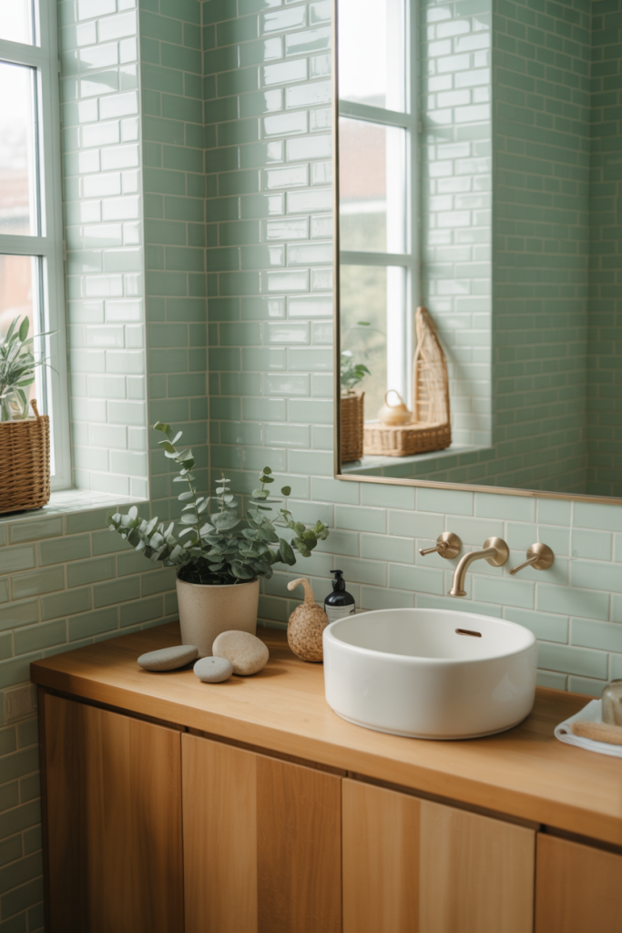 There’s something grounding about green tiles — especially sage and eucalyptus tones. They make a neutral inspiration master bath feel organic and soothing. Try pairing glazed ceramic tiles with wooden elements for a natural spa effect. This color works wonderfully in both guest and large bathrooms.