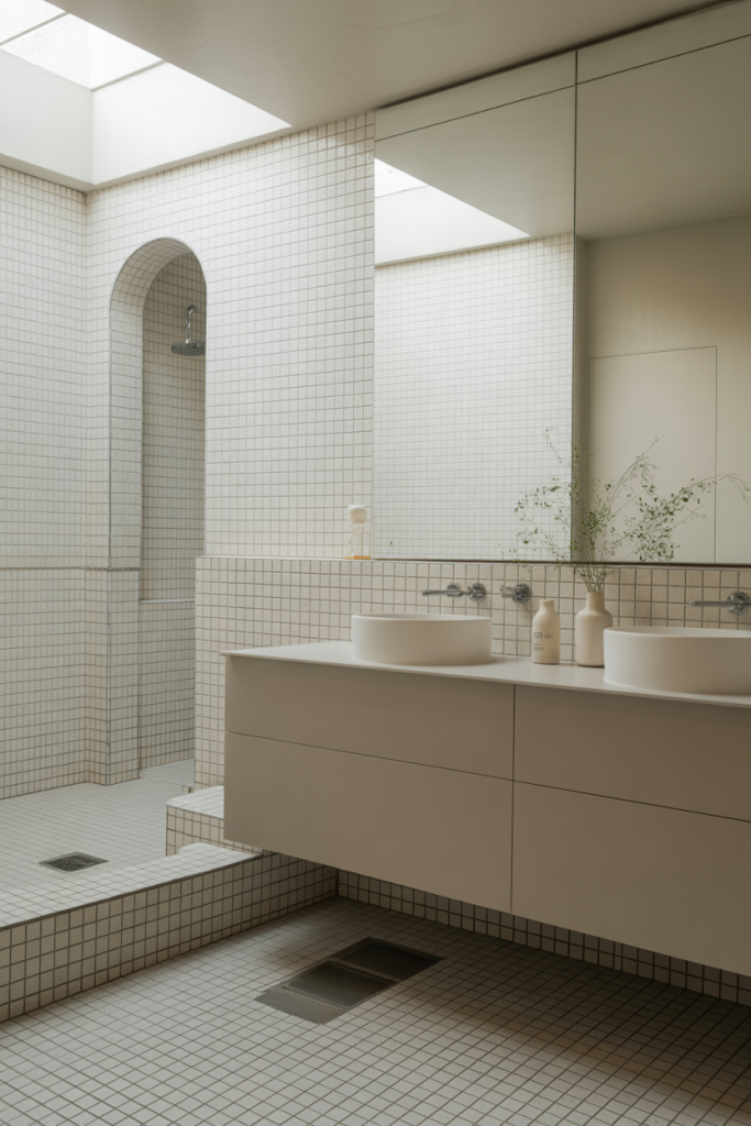 The all-white bathroom is getting a luxurious upgrade with varied shapes and finishes. Think scalloped tiles, glossy fish scales, or ribbed floor and decor patterns that add visual interest without color. White bathrooms now feel less sterile and more sculptural — especially with soft lighting and layered materials.