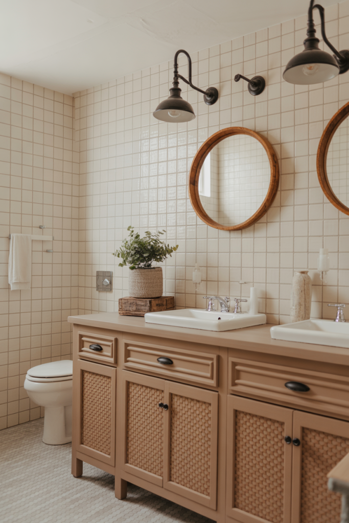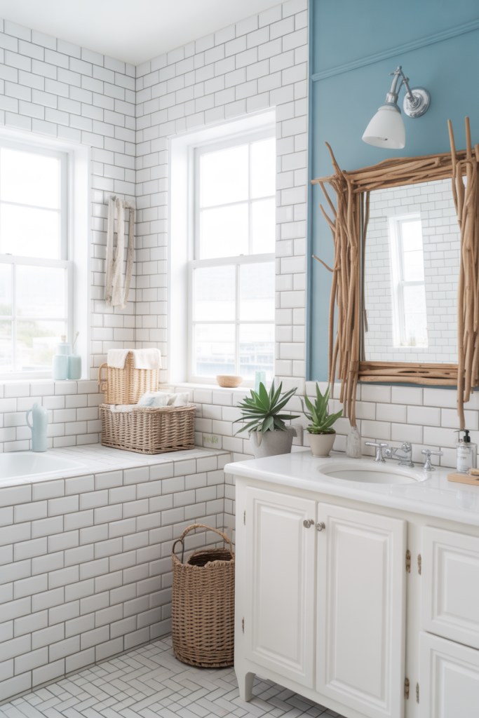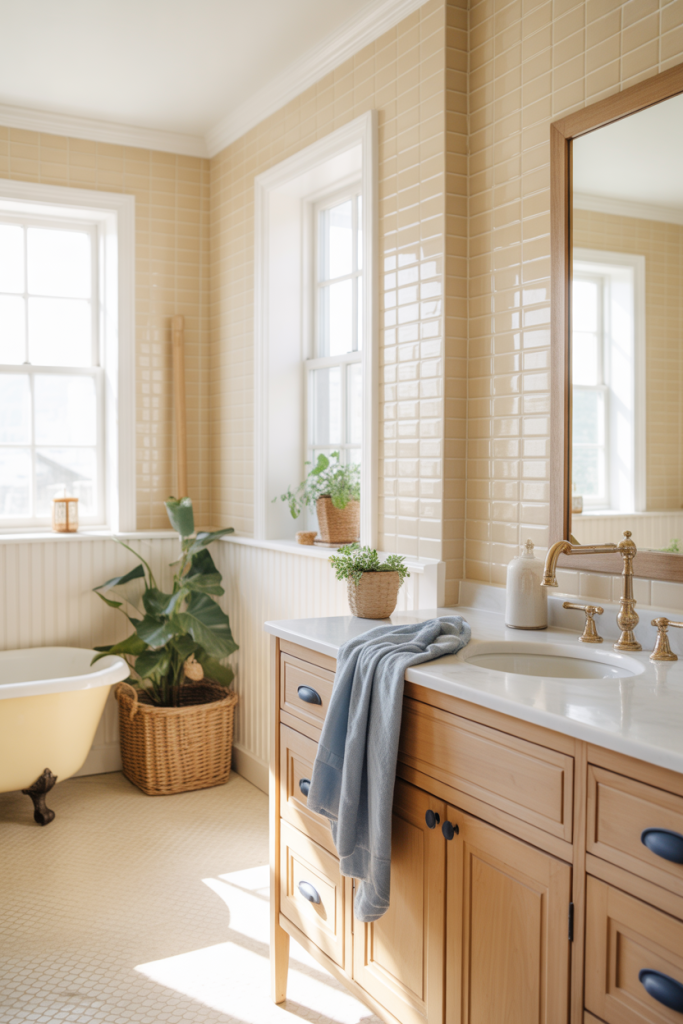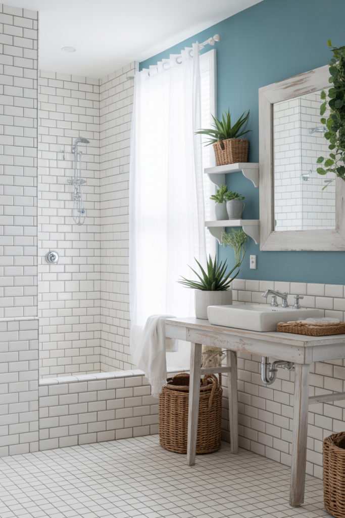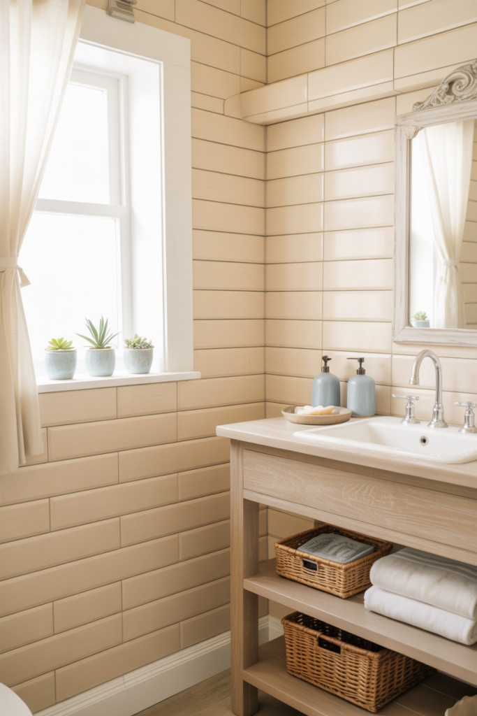 Blending coastal breeziness with farmhouse comfort defines this charming 2026 trend. Combine beige shiplap-look tiles with soft blue or green accents. This mix feels familiar yet refreshing — ideal for a guest or master bath. Designers often add woven textures and natural fibers to enhance the beach-meets-country mood.