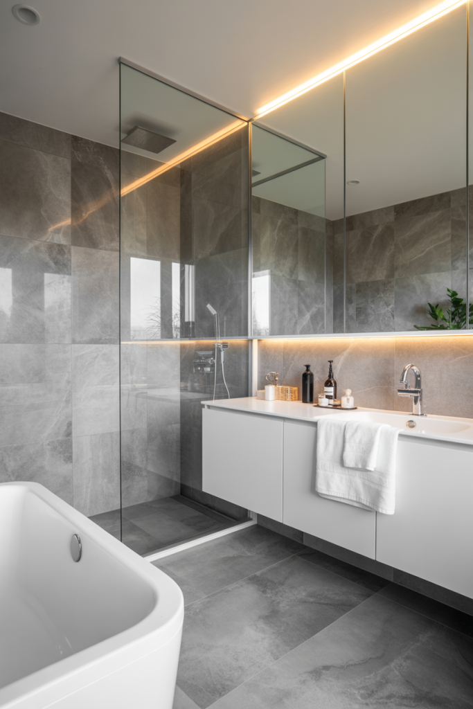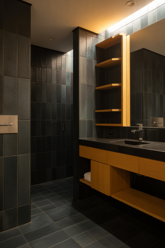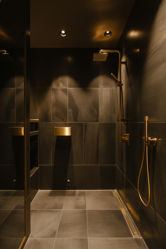 For those who crave sophistication, dark bathrooms are taking center stage. Deep charcoal porcelain or textured slate tiles set a bold tone, especially paired with brass or gold hardware. This look feels intimate yet striking, transforming even small bathrooms into moody retreats. As Architectural Digest puts it, “Darkness done right is drama done elegantly.”