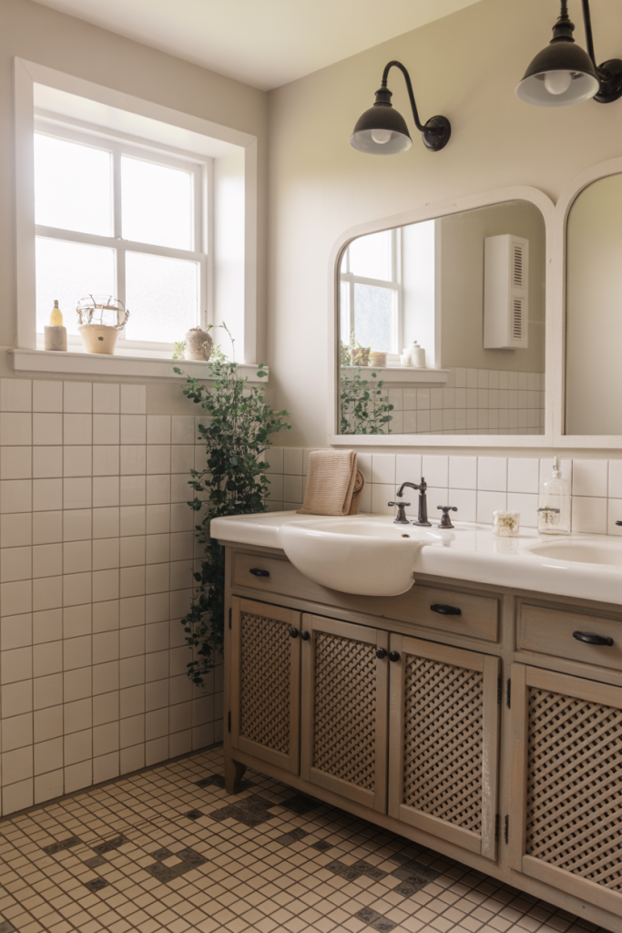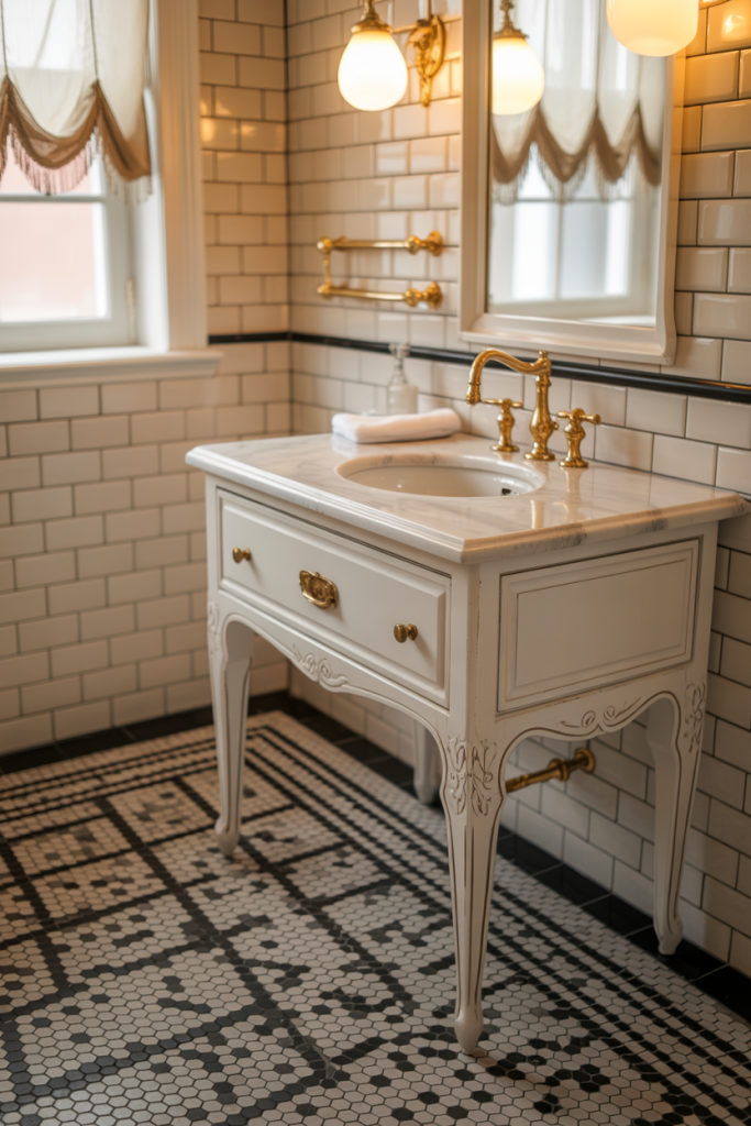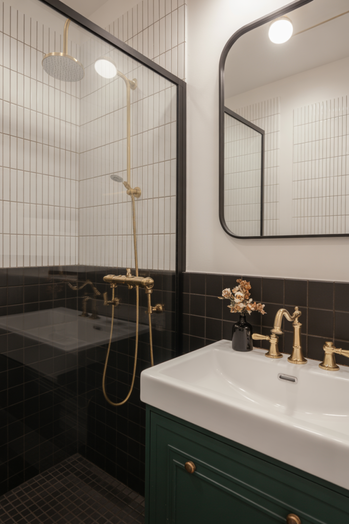 If you love nostalgia, vintage patterns are making a big return — especially mosaic or penny tiles in black and white. Use them on the floor or as an accent wall behind a shower walk area. Pairing them with brass fixtures instantly brings warmth and a timeless feel. Designers at House Beautiful note that vintage touches ground contemporary spaces beautifully.