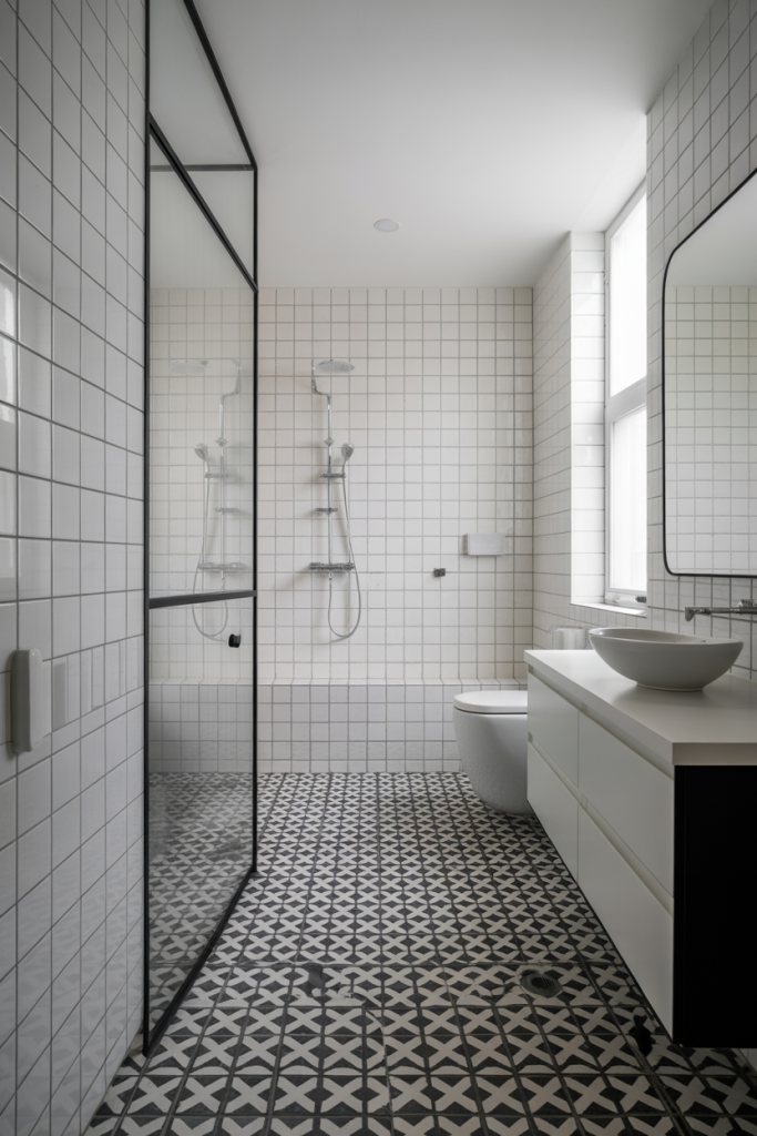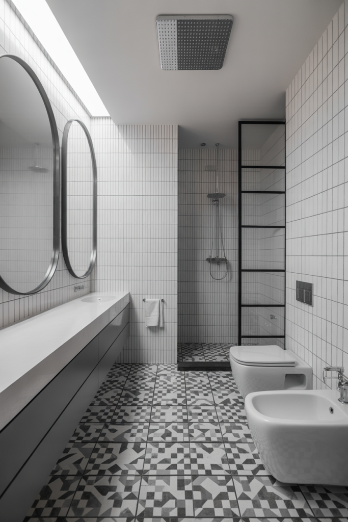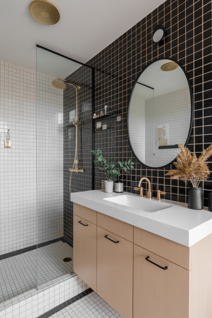 For a dramatic yet balanced look, black and white geometric tiles dominate design forecasts. They’re perfect for shower tub surround half walls or accent floors. This modern contrast adds rhythm and confidence — a nod to both art deco and Scandinavian influences. Use minimal accessories to let the tiles speak for themselves.