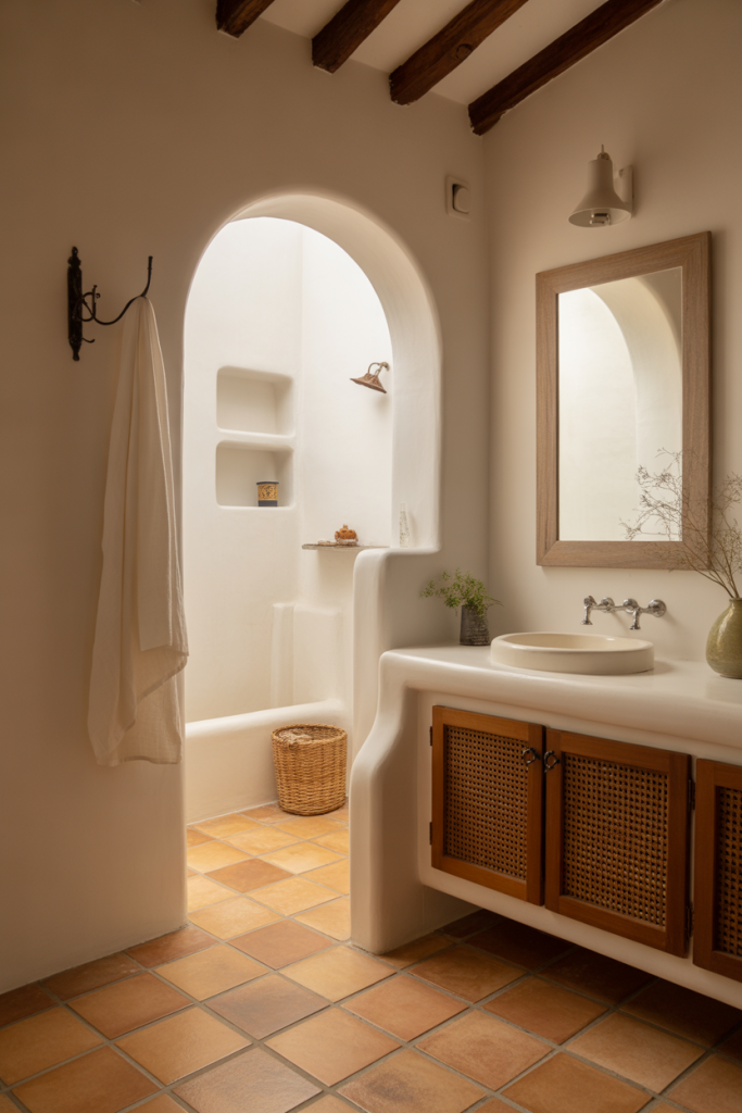 In the year 2026, designers are taking a trip back in time and adopting the earthy beauty of terra-cotta tiles – hot, baked, and full of character! Such terra-cotta tiles come from ceramics and allow for the exact Mediterranean touch! In fact, such tiles perfectly blend well with the white plaster wall! Also, the addition of textures makes it the ideal fit for the small bathrooms!