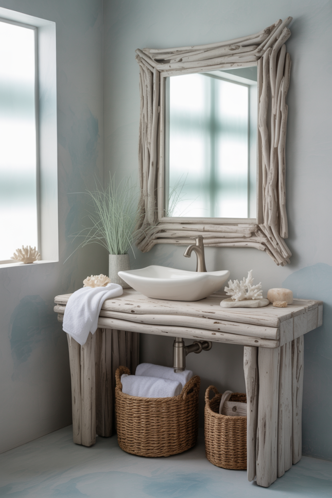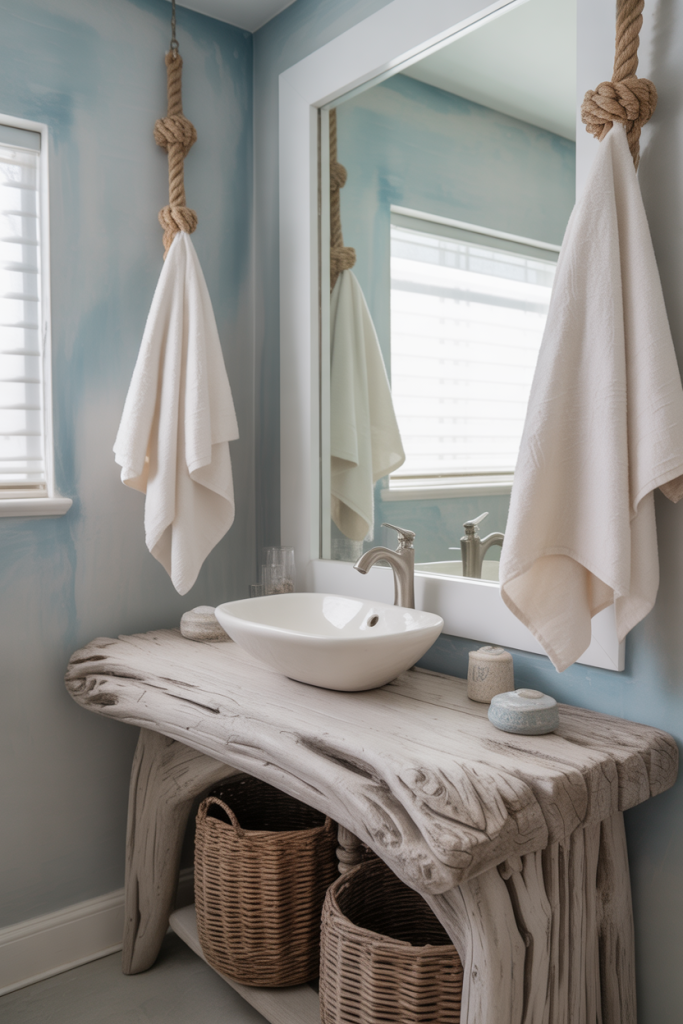 And for an understated yet refreshing take on the coastal look? Try the misty gray color scheme dotted with a dash of soothing blue! The result? An elegant yet soothing look designed for the ultimate coastal-chic ambiance, perfectly achieved in combination with driftwood vanities and sandy brown area rugs! Add glass details for the ultimate luxury touch!