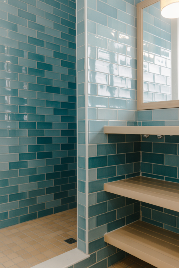 Ocean-inspired blue tiles remain a favorite for 2026, especially in coastal homes. Think hand-glazed subway tiles or rippled finishes that mimic the sea. Combine these with crisp white grout and sandy beige flooring for a relaxed yet elevated look. Designers like Amber Interiors often use blue as a statement in otherwise neutral bathrooms.