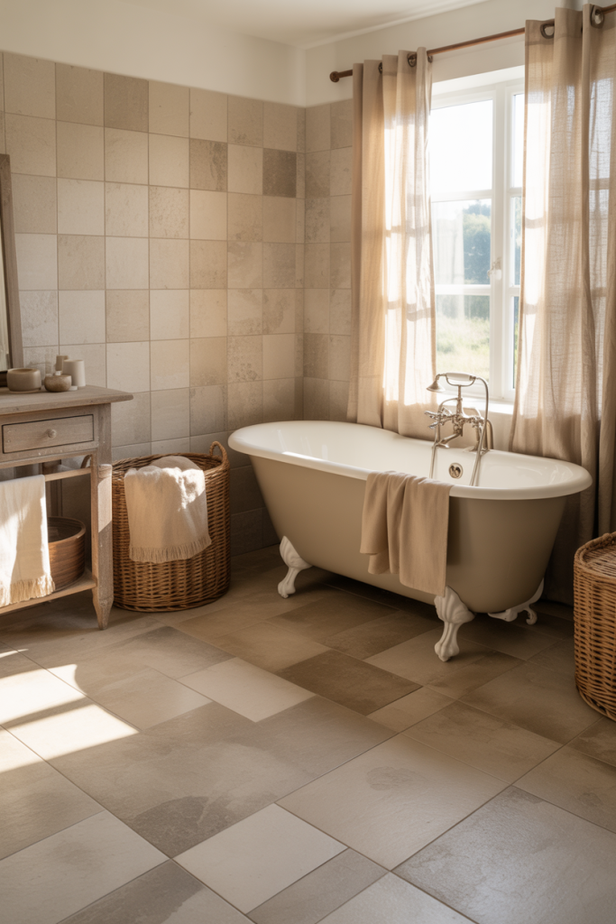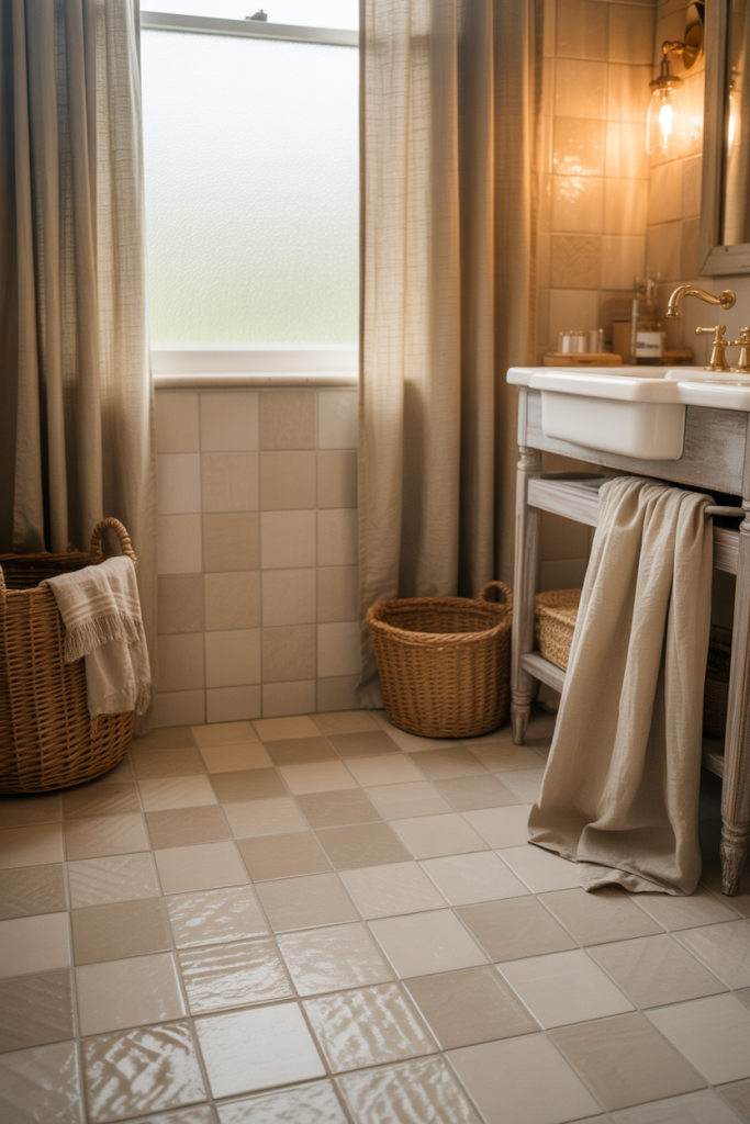 Soft beige tones never go out of style — they’re the foundation of traditional and farmhouse interiors alike. In 2026, designers play with large-format porcelain tiles and warm undertones to make spaces feel expansive. Add linen curtains or woven baskets for a textured finish that feels lived-in and timeless.