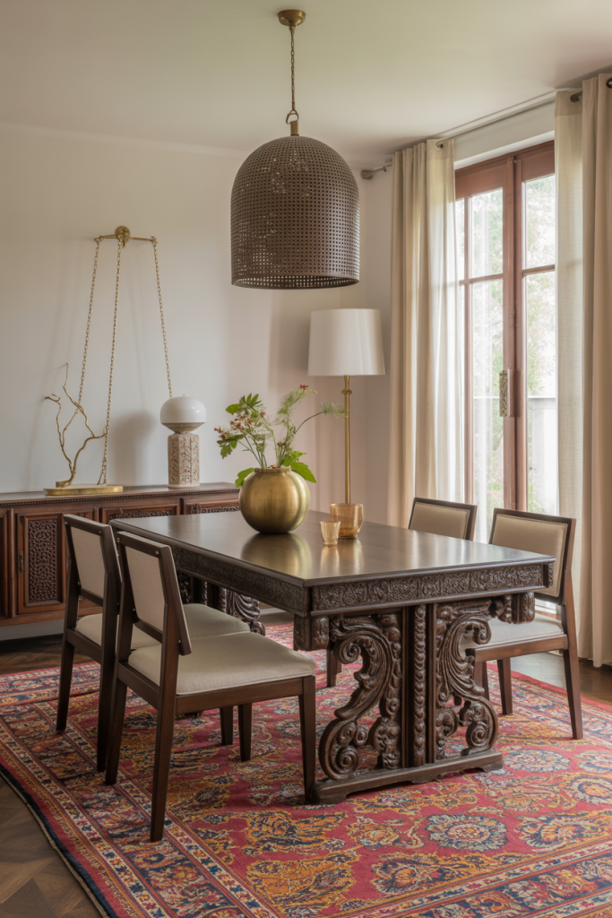 An Indian-themed dining area can go from being so very bold to so very elegant. Wood carvings, brass bowls, colored fabrics, and jewel-toned accessories instantly create depth. One home I toured belonged to a designer who incorporated an Indian sideboard that instantly set the tempo of the room. And what better way to marry Indian flair with modern elegance than with modern sophisticated furniture choices?