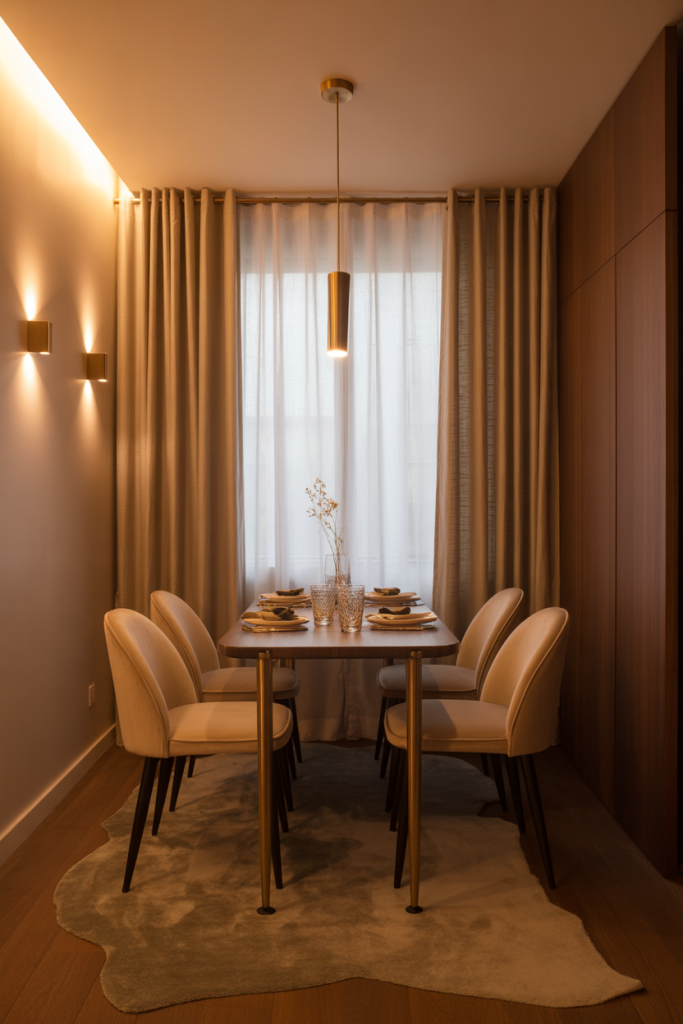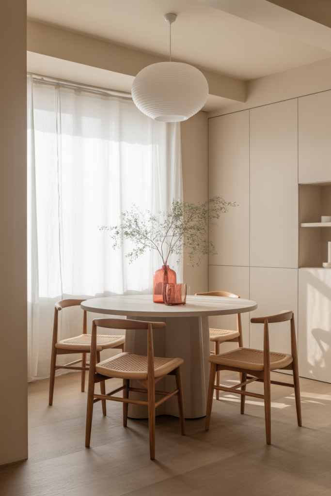 Adding blush or muted pink details turns an ordinary dining area into something unexpectedly uplifting. Whether it’s chair upholstery or a handmade ceramic vase, pink warms up neutrals beautifully. A stylist friend told me that pink “behaves like a soft spotlight,” and after seeing it in a tiny small space dining corner, I believe it. It’s playful yet grown-up, especially paired with brass or smoked glass.