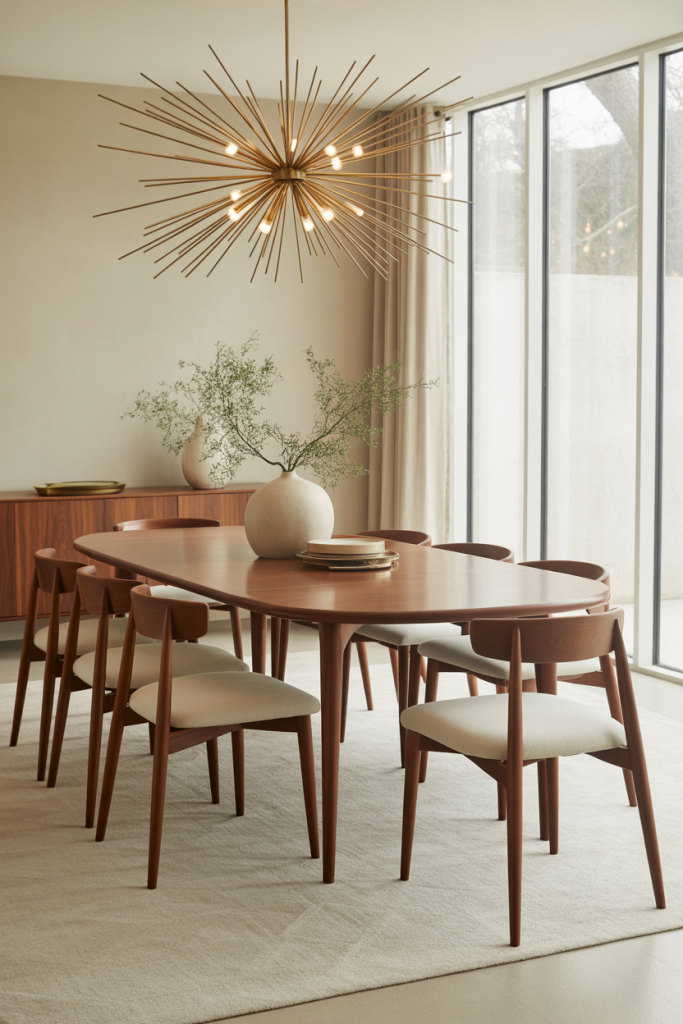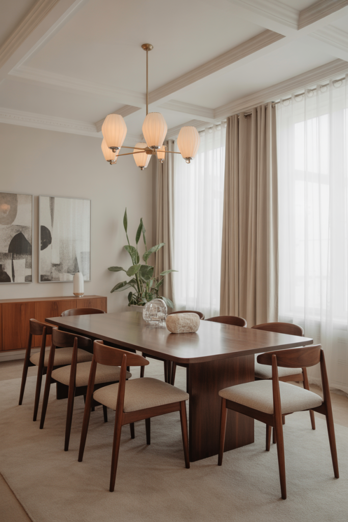 A favorite among younger families, this look mixes modern classy elements like brass accents and tailored chairs with lived-in textures. It’s simple but elevated, ideal for small space dining rooms where every choice matters. I once watched a designer layer a slim brass lamp next to a vintage bowl—such a tiny pairing, yet instantly classy. This style thrives on subtle shine and practical comfort.