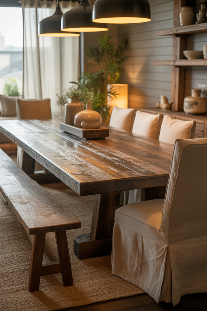 The new farmhouse—and especially the 2026 modern farmhouse—avoids clichés. Instead, it embraces patina, reclaimed wood, and honest materials. A long plank table brings everyone together, making it perfect for big families or holiday gatherings. A designer once told me, “A real farmhouse is less about décor and more about life happening around the table,” and I’ve never forgotten that.