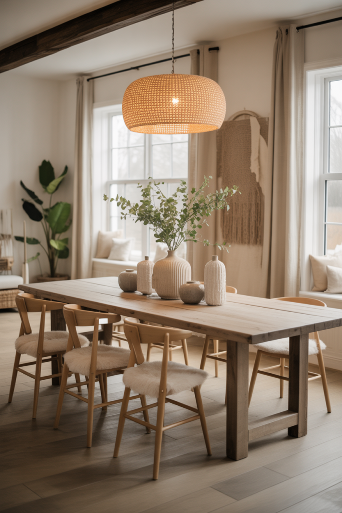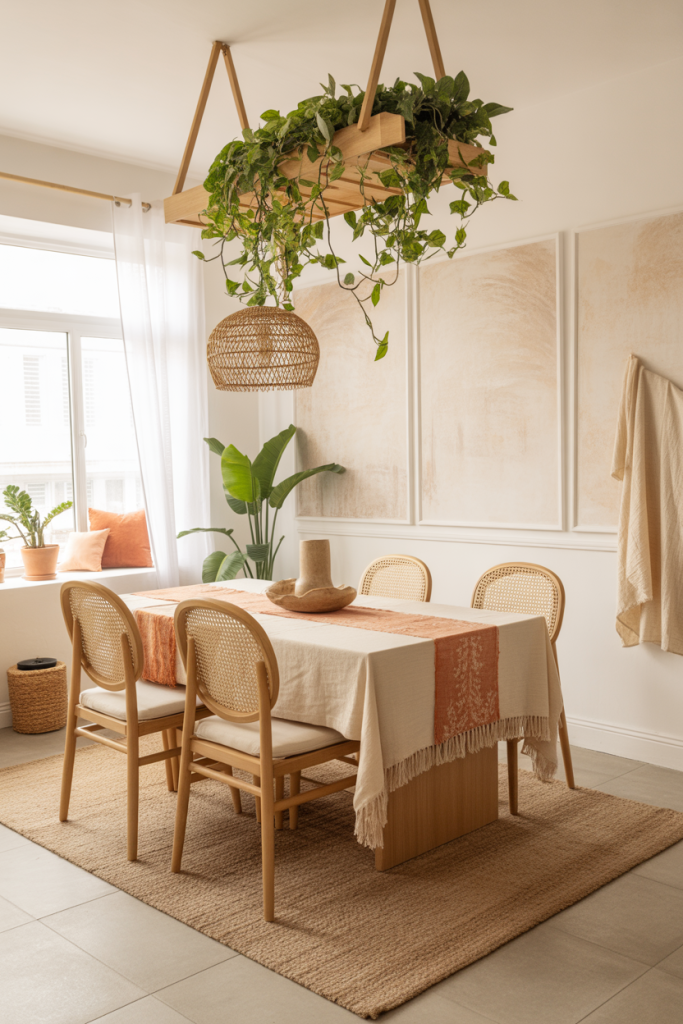 The boho approach to dining rooms continues growing, especially for people who love an unstructured, creative feel. Layers of textiles, rattan, pottery, and plants make the space feel alive. I remember a small loft dinner where mismatched cushions created more warmth than any formal setup—that’s the magic of boho. It’s casual, soulful, and full of inspiration.
