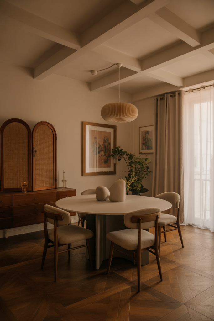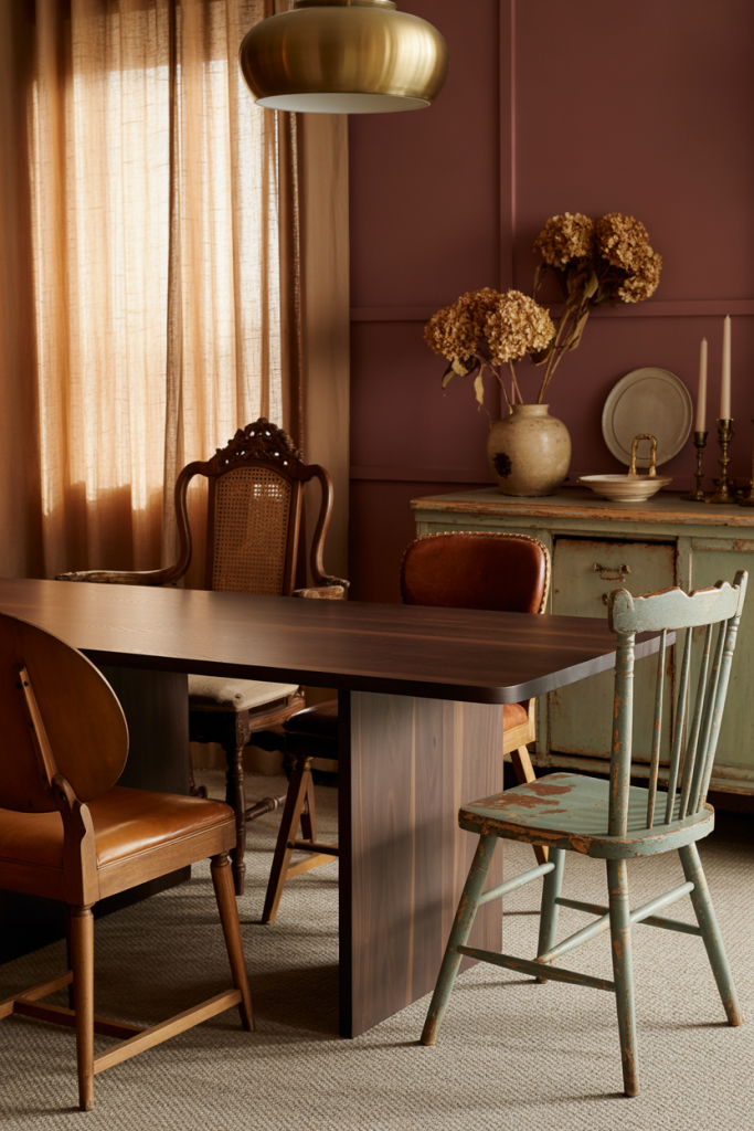 A curated mix of vintage and modern brings personality and soul. Antique chairs, old brass frames, or a patinated cabinet instantly warm up a dining room. I picked up a vintage mirror at a flea market once, and placing it behind a clean-lined table transformed the room from plain to poetic. Combine past and present for depth and charm.