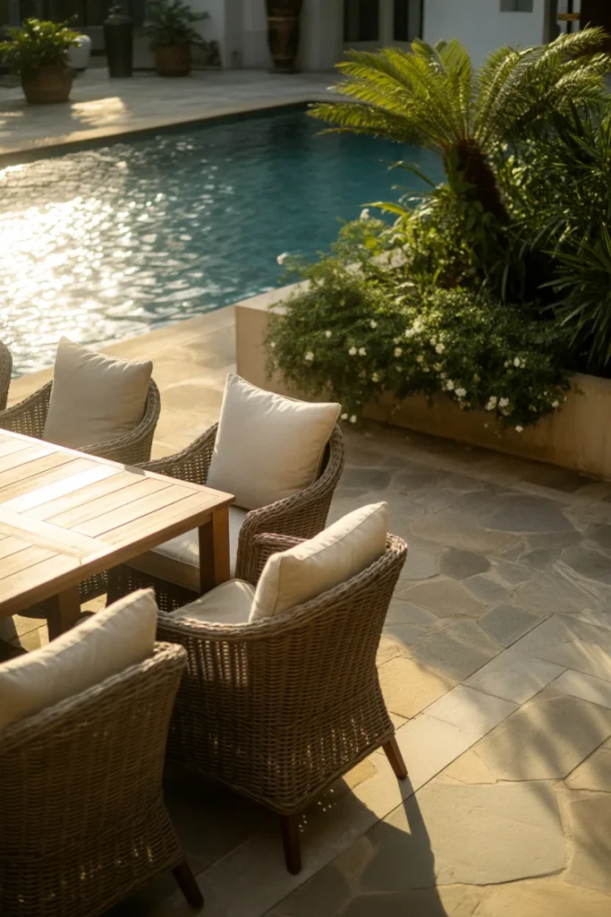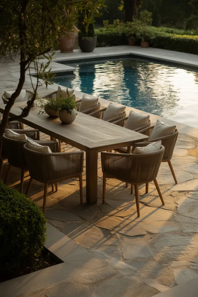 Patio dining sets should not be placed right up against the edge of the pool. Leaving a bit of space is both safer and more comfortable for kids and families. Good spacing makes the patio functional for daily use in addition to looking good in photos.