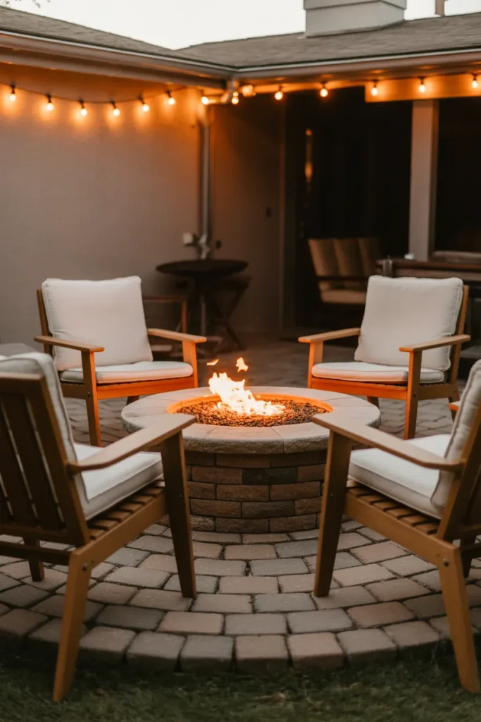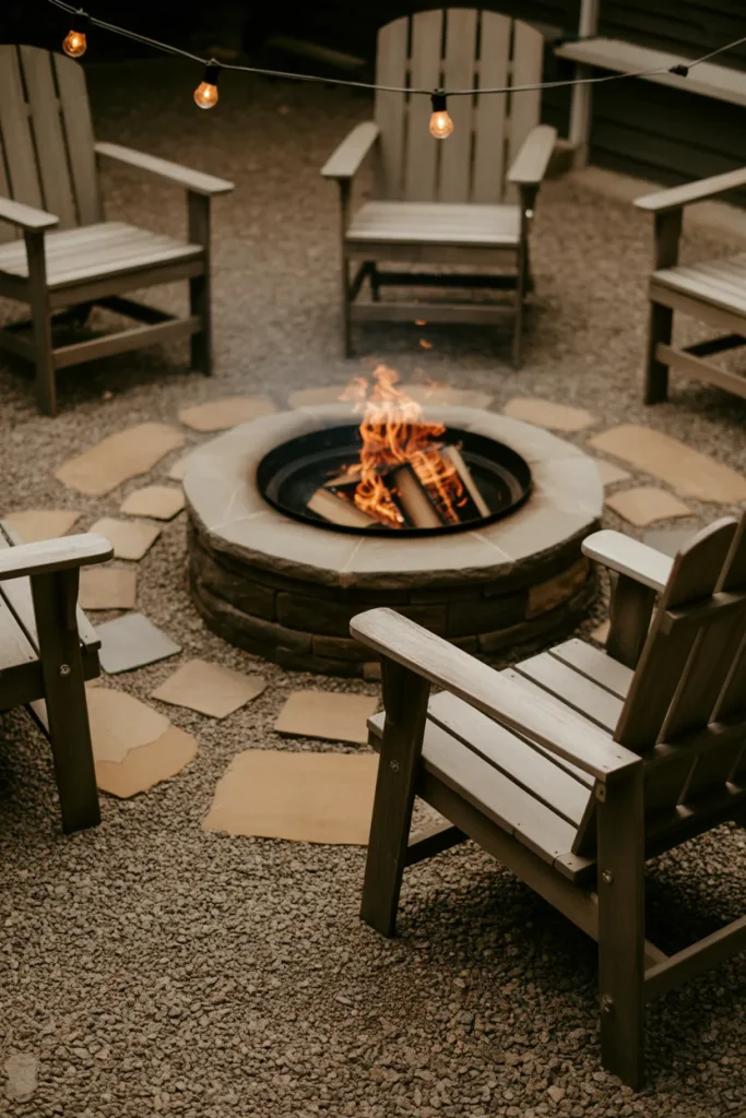 Fire pit patios are a classic and popular option for year-round outdoor enjoyment. In a backyard setting, a circular arrangement of seating fosters conversation and makes the space feel visually balanced. The simple, relaxed look of the natural stone and chairs, along with some low-key lighting, makes it a good option for late-night evenings.