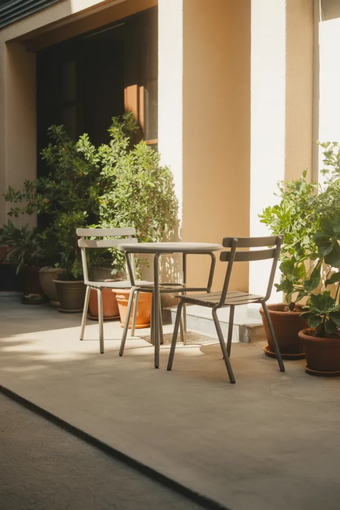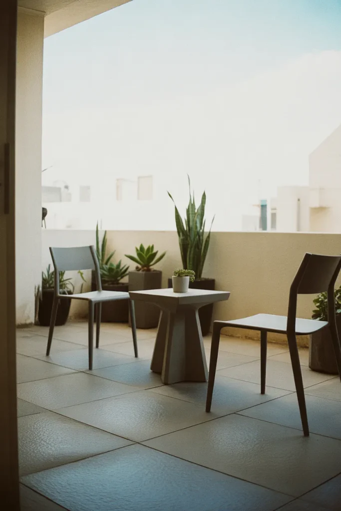 Apartment patios are becoming more intentional as renters seek calm outdoor escapes. A concrete apartment patio paired with minimal furniture creates clarity rather than clutter. Neutral tones, compact seating, and a few well-chosen plants turn a small exterior into a quiet extension of the living space.