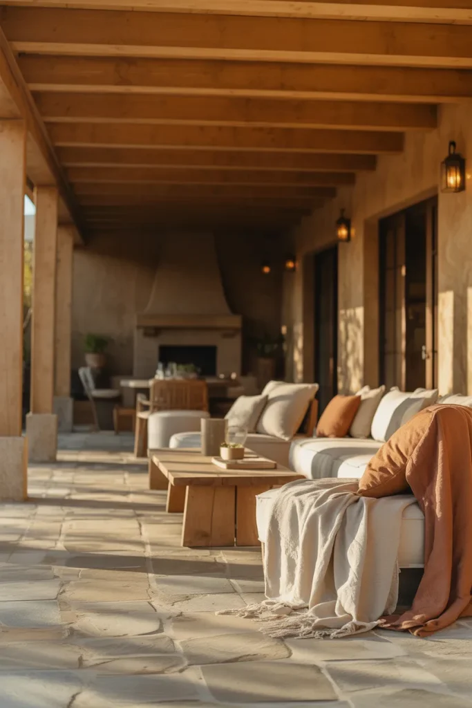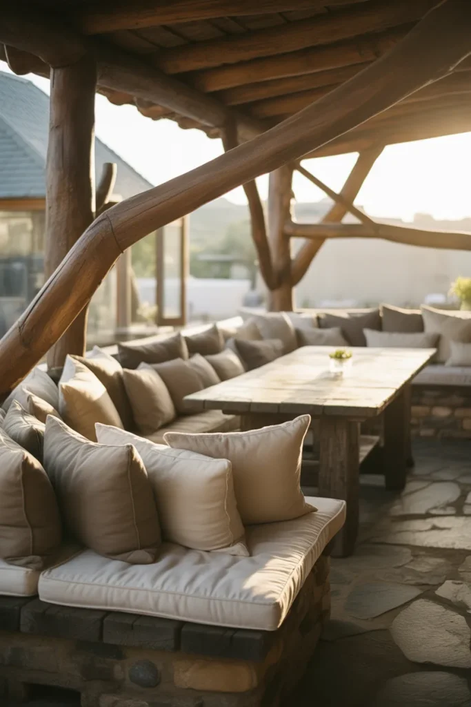 Not a rustic patio with cabin clichés. This is where warm, layered spaces feel real. A covered rustic patio with natural shelter materials: wood beams, stone floor, and textured fabric is a retreat. Cozy year-round for morning coffee or slow evenings outdoors.