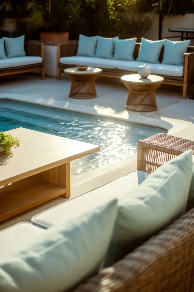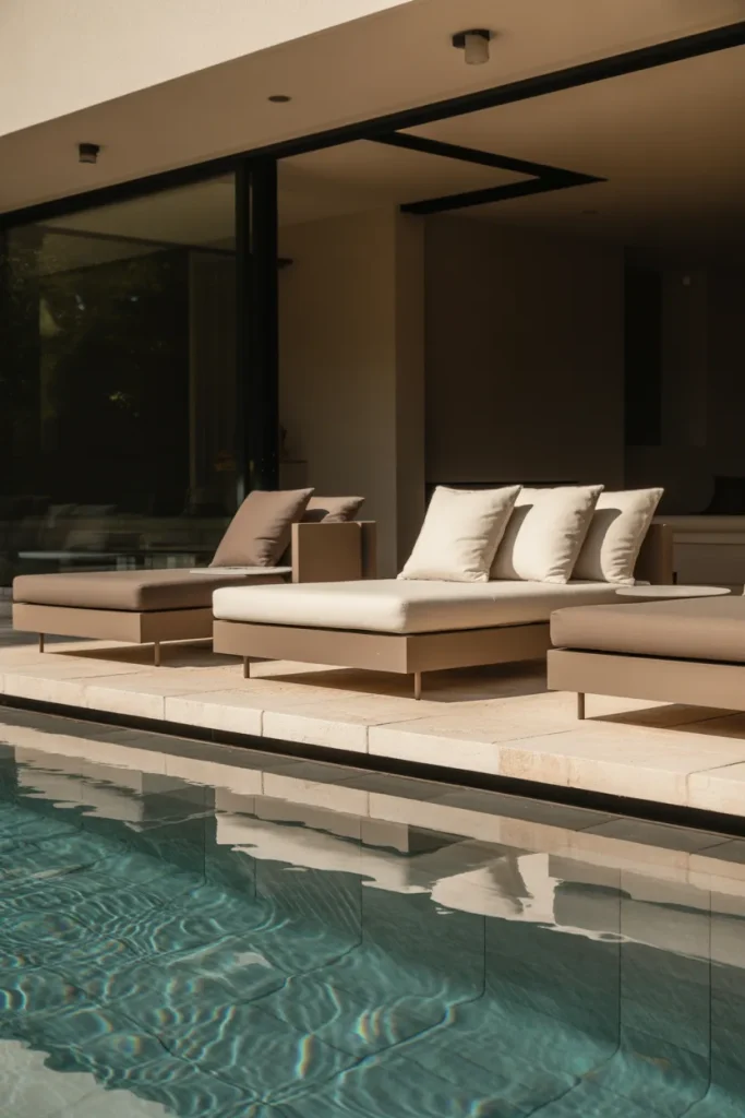 Modern pool areas now emphasize comfort as much as aesthetics. A contemporary poolside patio uses clean silhouettes, built-in shade, and muted colors to create a calm environment around the water. The result feels intentional rather than resort-themed.