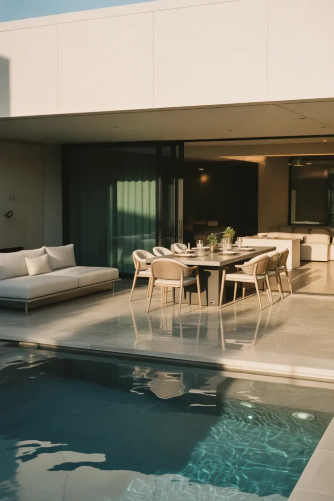 The integration of leisure with meals in one space epitomizes contemporary patio design. A modern pool and dining patio showcase a thoughtful balance between clean lines and effective functional zoning of the two spaces so that neither one overwhelms the other. The use of consistent materials further reinforces the visual calm.