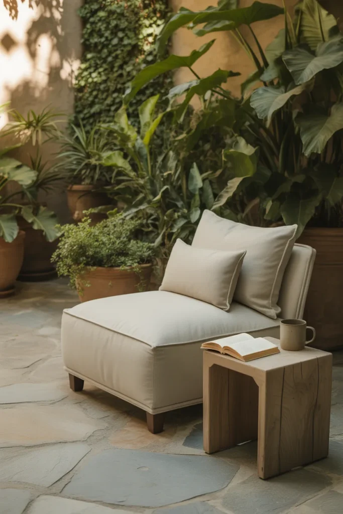 A reading patio in the open air is a new quiet luxury for homeowners who are looking for slow moments outdoors. This patio is designed as an open garden retreat and shifts the focus from entertainment to comfort, shade, and calm. A deep chair and side table, along with surrounding plants, create an area that feels personal and intentionally unhurried.