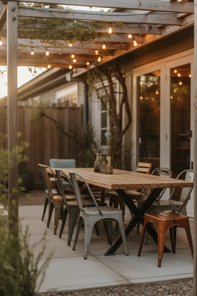 Backyard dining can feel special without needing too much elaborate construction. A simple table serves as the center for an Affordable Backyard patio, which, with flexible seating, encourages frequent dining outdoors. Adaptability is achieved with string lights, movable chairs, and a neutral surface.