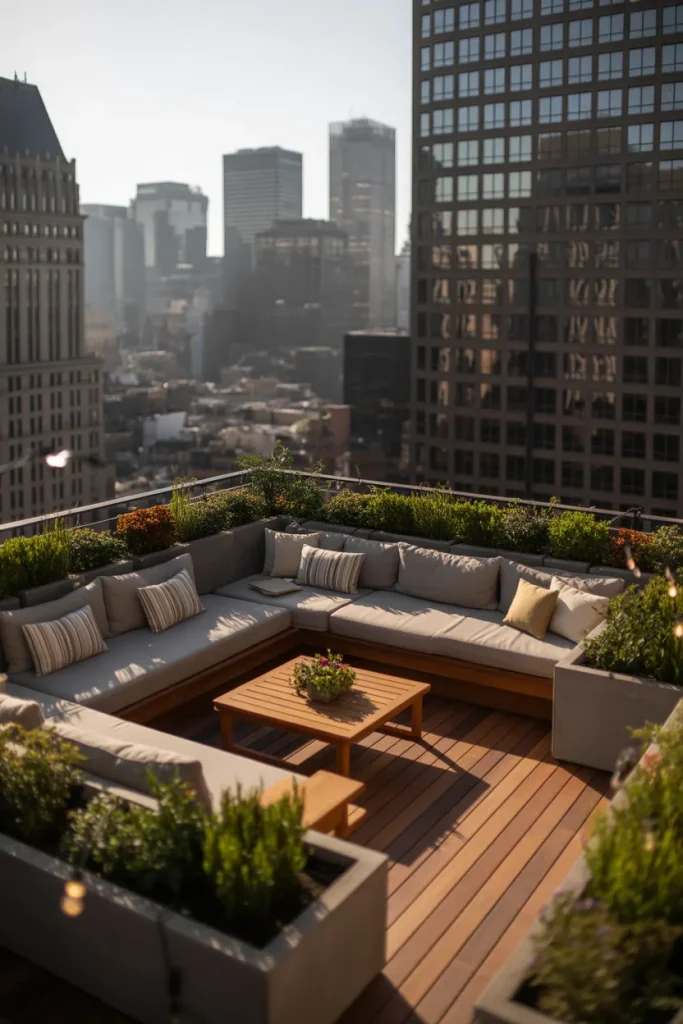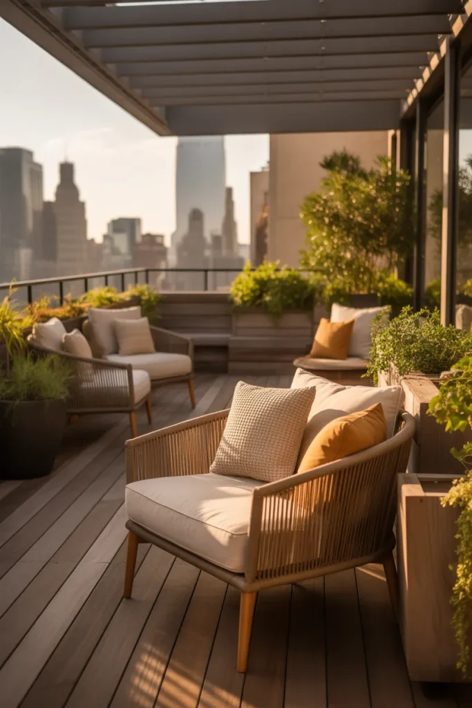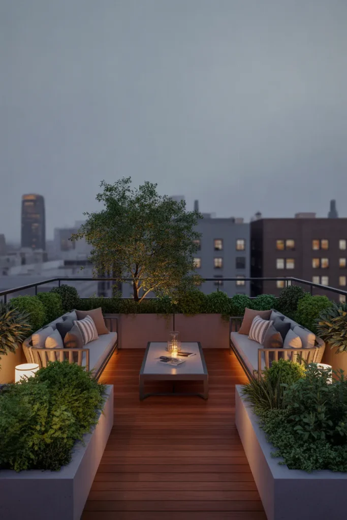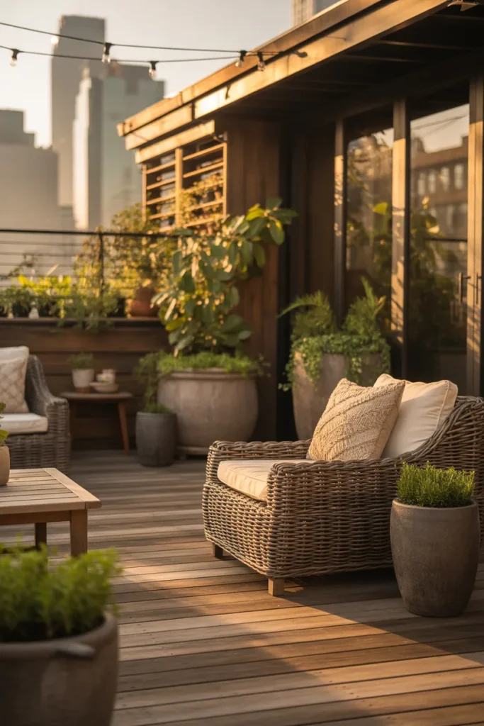 Modern city living may be synonymous with no outdoor space. But a rooftop apartment patio adds a personal outdoor escape intimately above the city. The use of compact furniture, planting boxes, and string lights creates a cozy atmosphere and allows for the delineation of use zones while an uncluttered footprint is preserved. The use of privacy structures like tall planters and lightweight screens provides windbreaks and prevents people from seeing into the space.