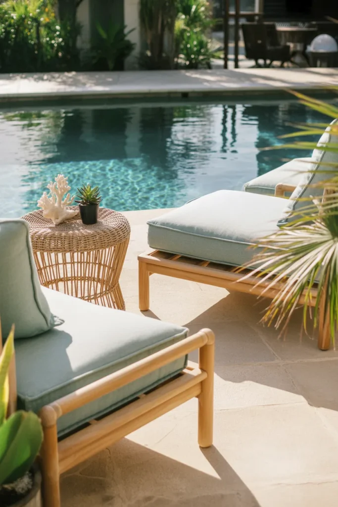 Coastal design remains impactful for outdoor spaces, especially by the water. A coastal poolside patio embraces dreamy colors, with a natural texture and open aesthetics that are inviting for prolonged use. Light woods, soft blues, and loungers contribute to a seamless transition from the pool to the seating area.