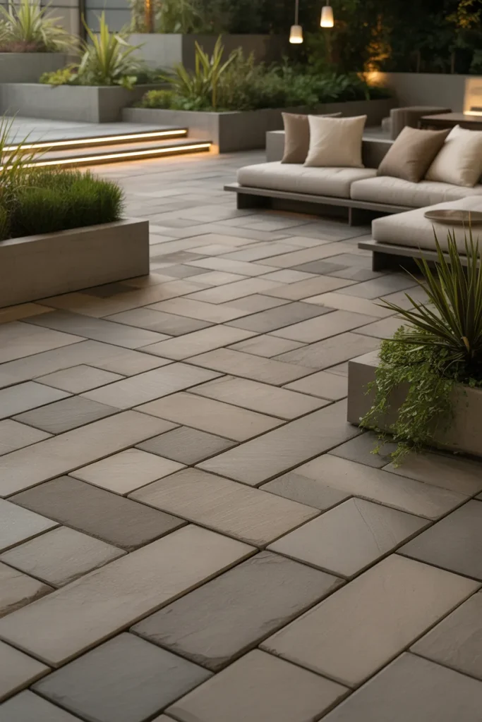 The suggestion from experts is to mix different sizes or directions of pavers to add depth while staying uncluttered. Using readily available materials, such as in a blank slate patio, small design adjustments can transform the patio from feeling mass-produced to feeling custom.