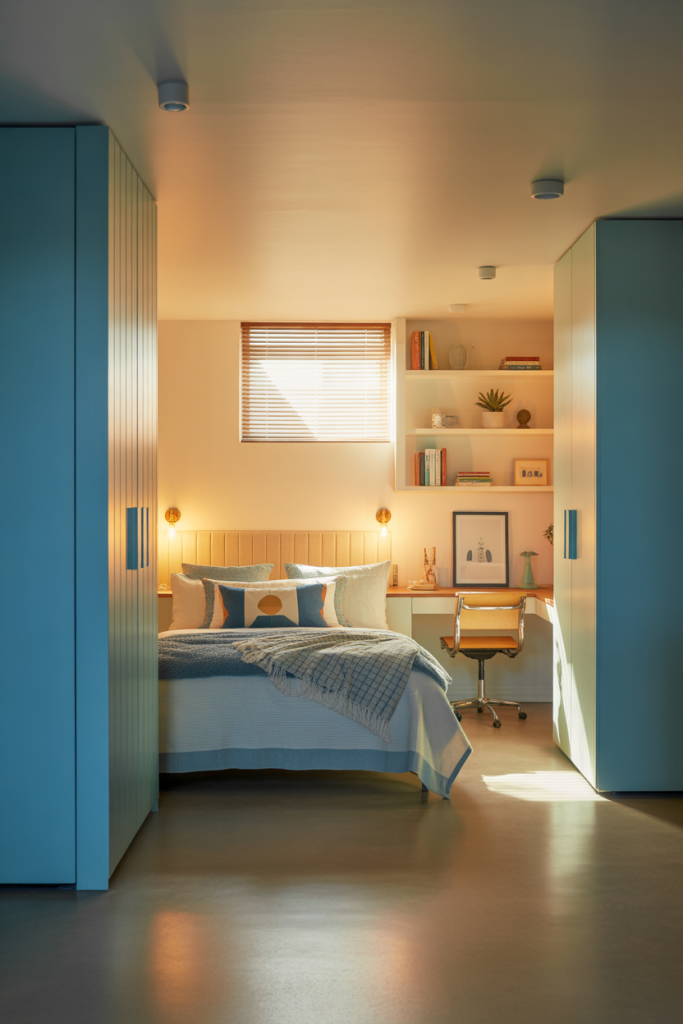 Older kids appreciate rooms that feel grown-up but not too serious. Soft blues, layered lighting, and adaptable storage make the room both kid-friendly and suitable for kids transitioning into new interests. This style also helps brighten low-ceiling rooms while keeping the vibe cheerful.
