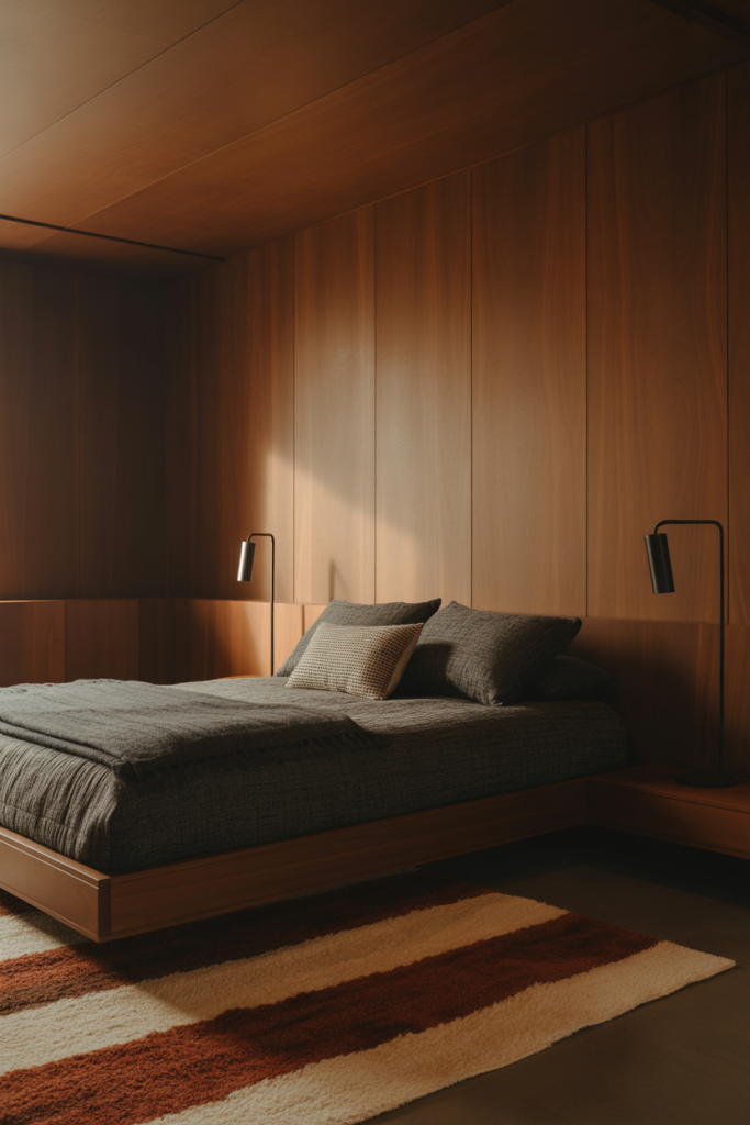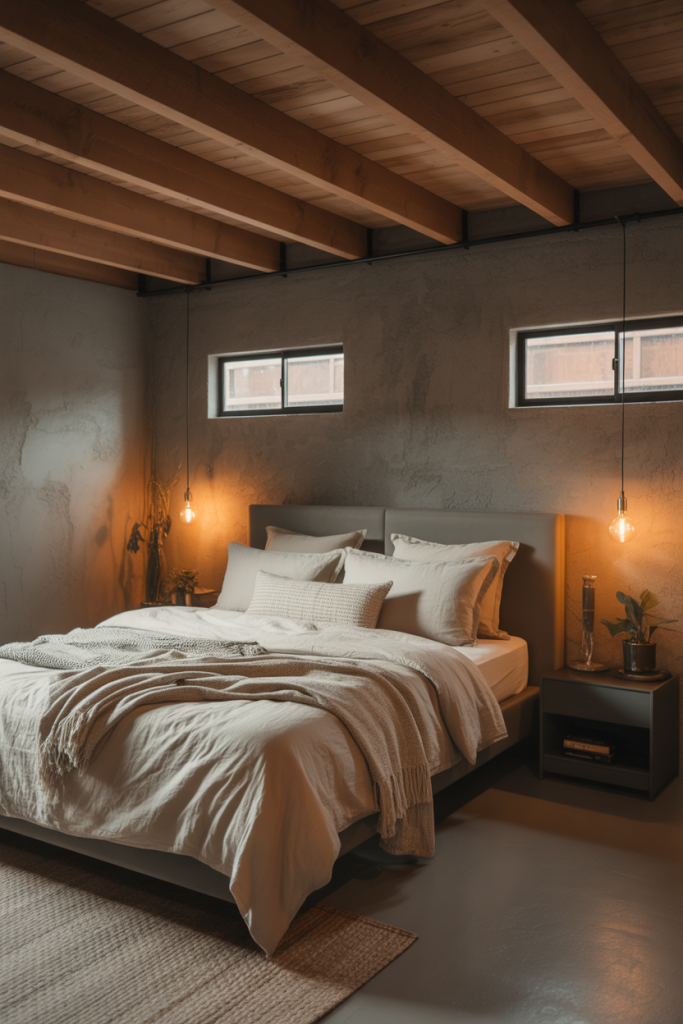 This style blends exposed materials with soft touches, perfect for couples who want a modern nest. Darker metals, natural fibers, and smooth concrete surfaces create a bold yet aesthetic vibe. It’s especially great in an open basement plan or for couples seeking something different from typical upstairs bedrooms.