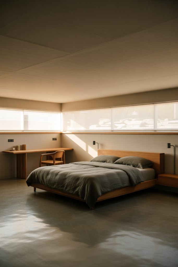 A broad, uncluttered basement is ideal for a relaxed, masculine aesthetic. Neutral tones, straightforward furniture, and minimal décor fit beautifully into a man’s style bedroom. The look pairs well with a large layout and can support zones for sleep, hobbies, or even a mini workspace with an open flow.