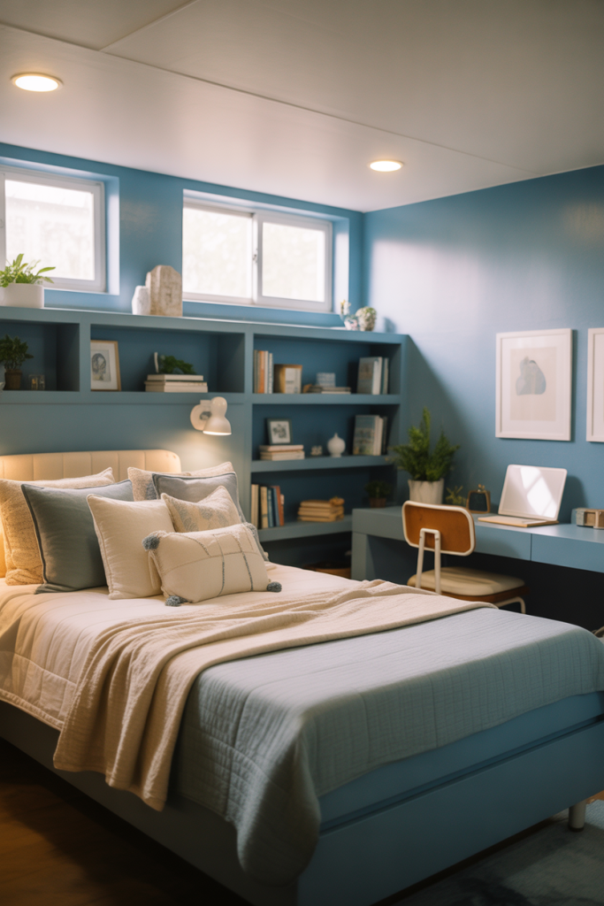 Older kids appreciate rooms that feel grown-up but not too serious. Soft blues, layered lighting, and adaptable storage make the room both kid-friendly and suitable for kids transitioning into new interests. This style also helps brighten low-ceiling rooms while keeping the vibe cheerful.