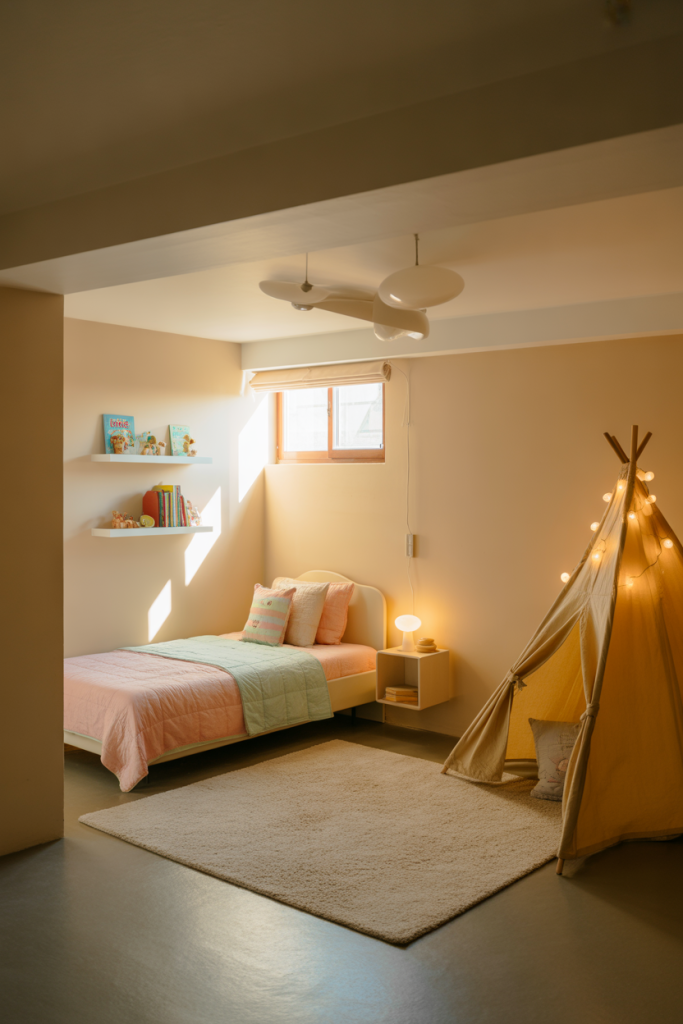 A basement bedroom designed for younger children needs warmth, clarity, and plenty of softness. Pale colors and gentle storage solutions make even a tiny space feel charming. Adding bright textiles helps offset a low ceiling or minimal windows while keeping things playful and kid-friendly.
