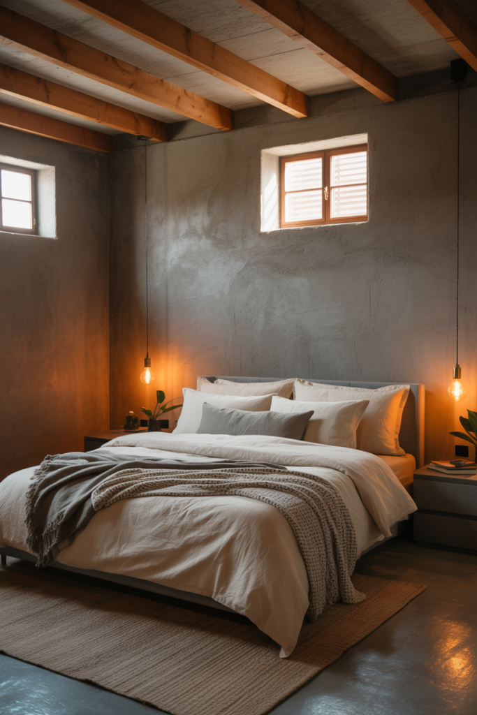 This style blends exposed materials with soft touches, perfect for couples who want a modern nest. Darker metals, natural fibers, and smooth concrete surfaces create a bold yet aesthetic vibe. It’s especially great in an open basement plan or for couples seeking something different from typical upstairs bedrooms.