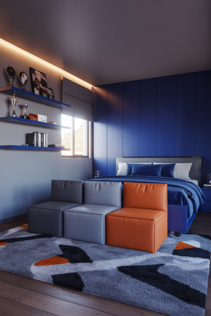 For families with athletic older kids, a fun basement bedroom can double as a hangout zone. Bold colors, clean shapes, and modular furniture help balance sleep and lounge time. This is ideal for teen boys’ man cave setups and works even in unfinished spaces or deeper, dark basements that need energy.