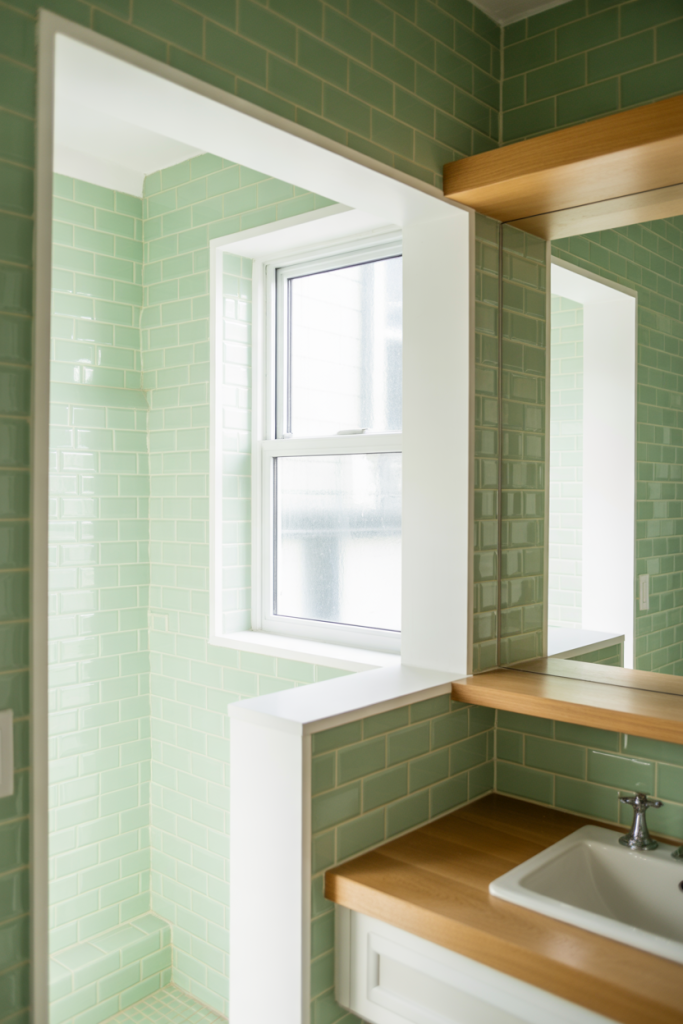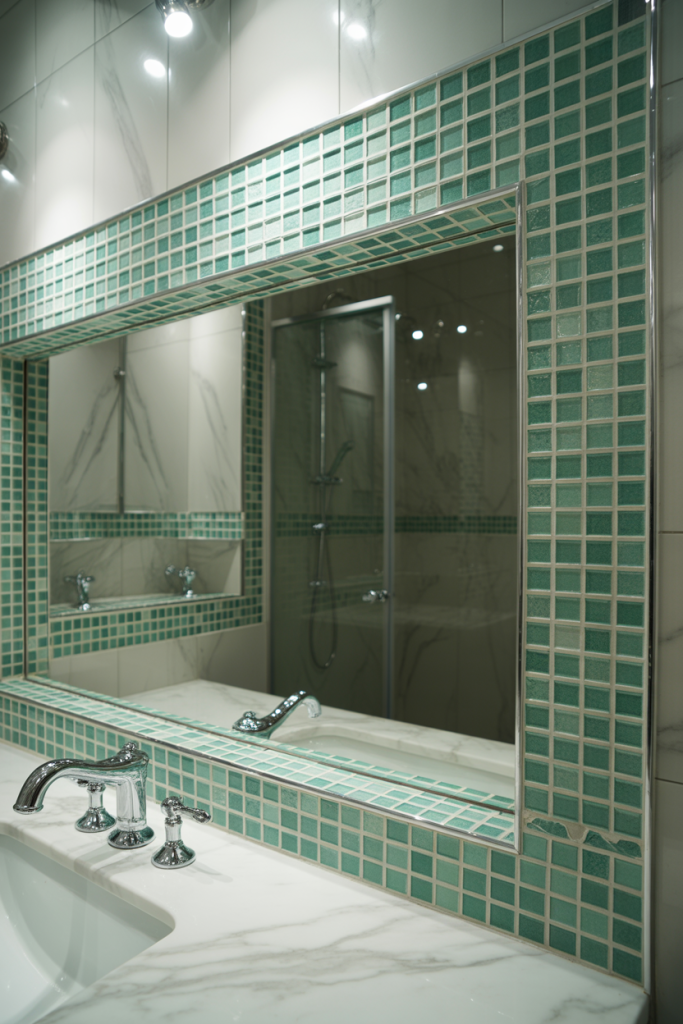 Jade shimmering mosaic borders add elegance without overwhelming the room. I’ve seen them used along vanity mirrors or outlining a shower wall for a jewel-like effect. These small details elevate even the simplest tile layouts. Pair jade mosaics with white or cream backdrops, or mix them with deeper tones for contrast. It’s a refined way to bring luxury into your space.