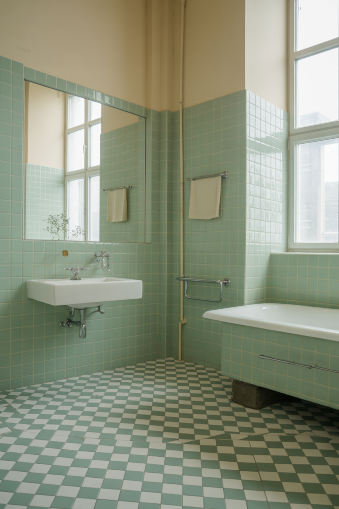 Sage greens with older geometric designs on the floor create the modern-vintage touch. A home designer told me that checkerboard designs on the tile surfaces of the home’s floors and walls “always come back,” with the latest designs being reflected even in the year 2026. This particular pattern complements well with the white cream tones that border the sage greens. Alternatively, the bold-grout option creates a stunning visual treat. This particular pattern suits very old apartments that have stood the test of time with their elements still visible and intact.