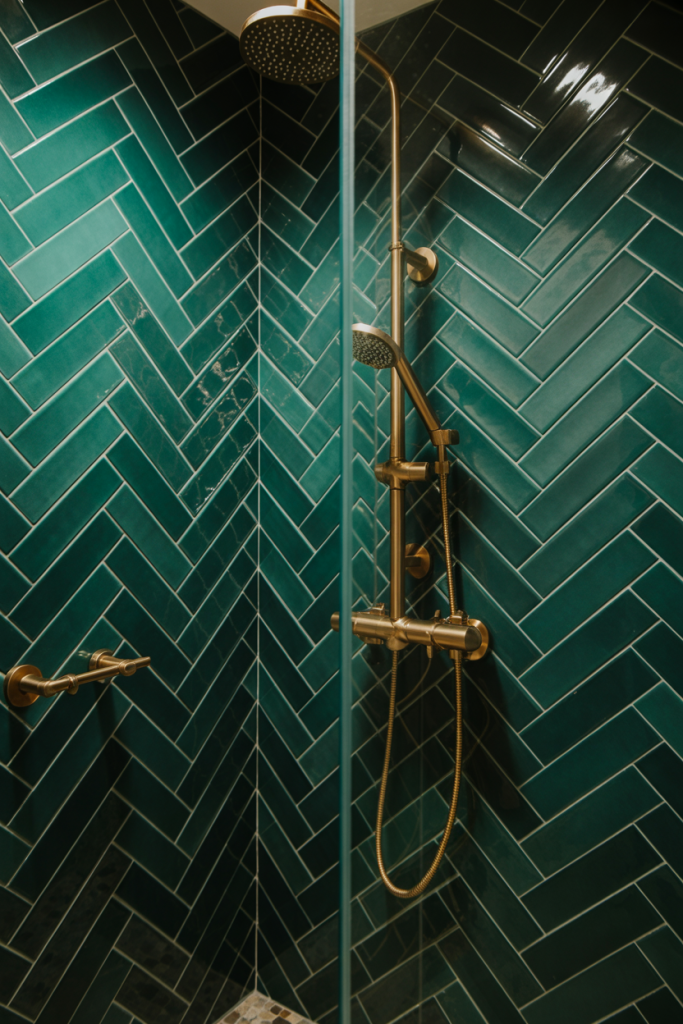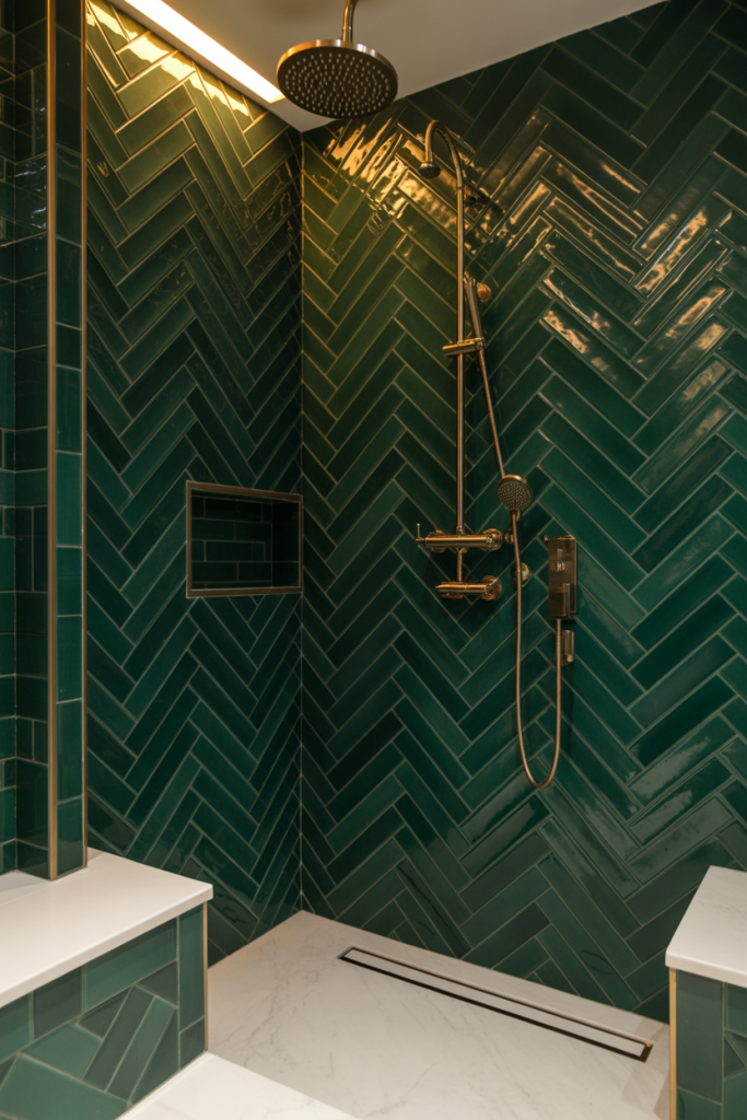 Emerald, glossy surfaces arranged in herringbone instantly create motion and luxury. I recall a remodel where emerald herringbone tiles transformed an otherwise tiny shower into a focal point full of depth. The angled placement adds character without needing busy décor. This design pairs nicely with gold hardware and crisp white counters for a balanced, elegant look.