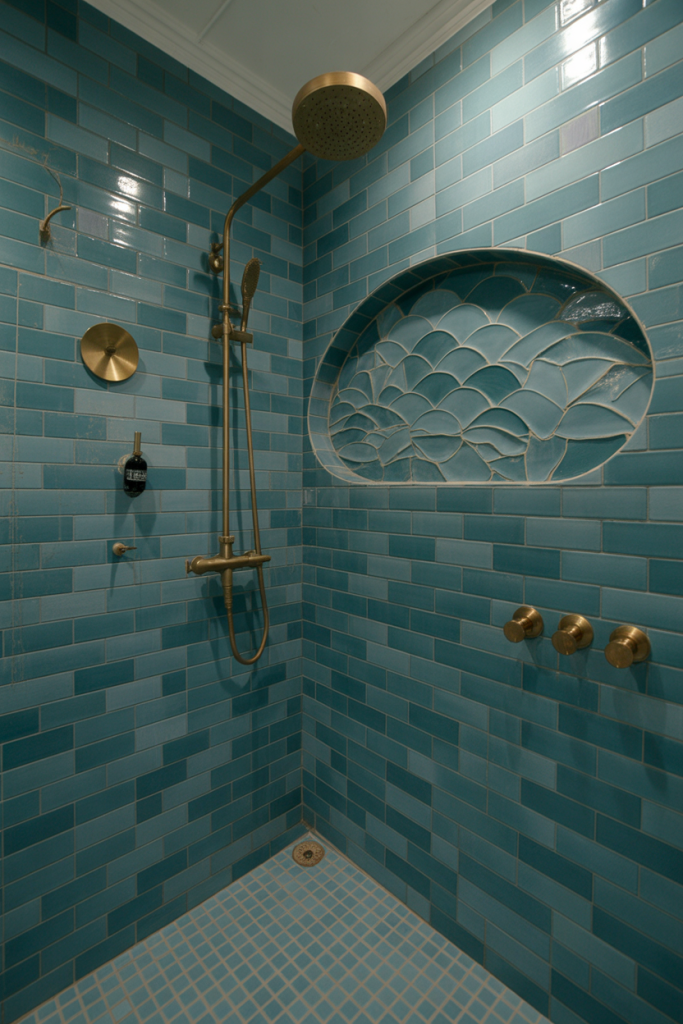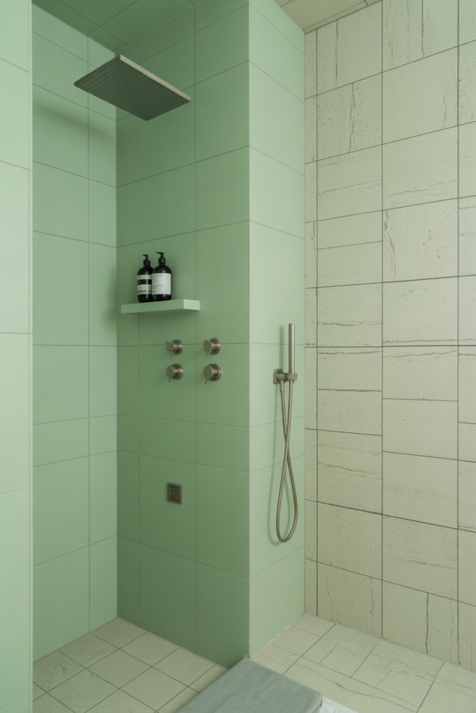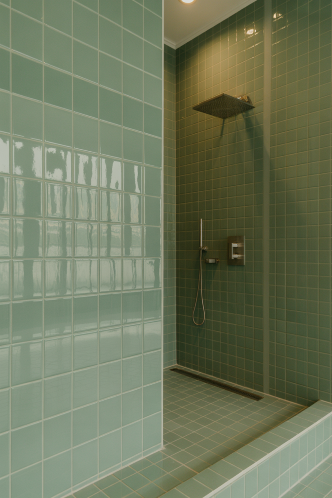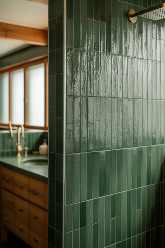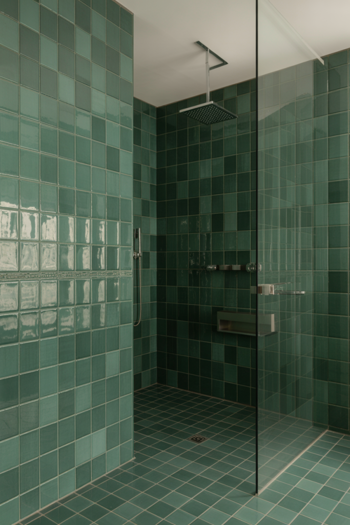 Dark, teal-leaning greens create a moody, cocoon-like retreat inside a shower. I remember a remodel where the homeowners said their dark-tiled shower “felt like the perfect escape after stressful days.” Pairing the deep shade with warm lighting and clean-lined fixtures prevents the look from becoming too heavy. This works especially well in walk-in showers with open glass, allowing the color to shine without closing off the room.