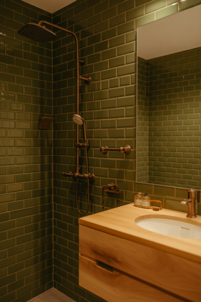 16. Olive Subway Tiles With Warm Bronze Fixtures